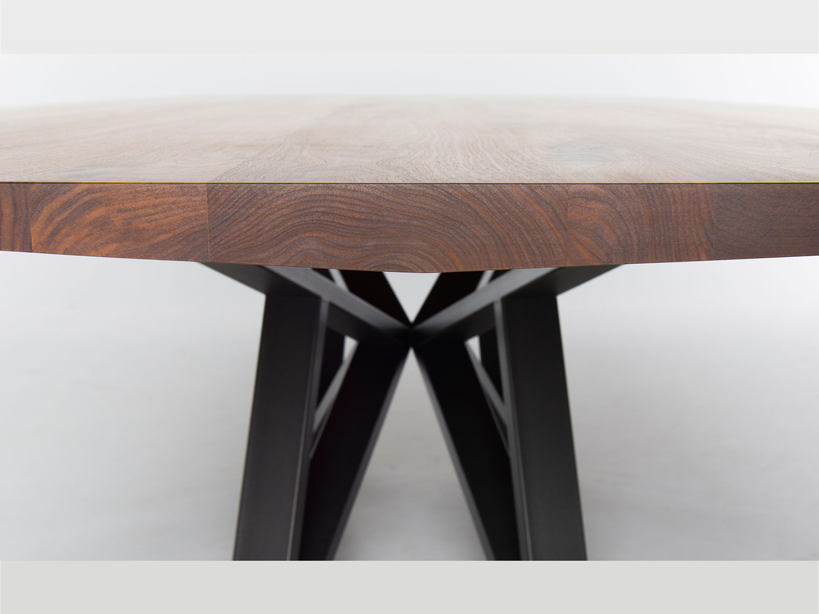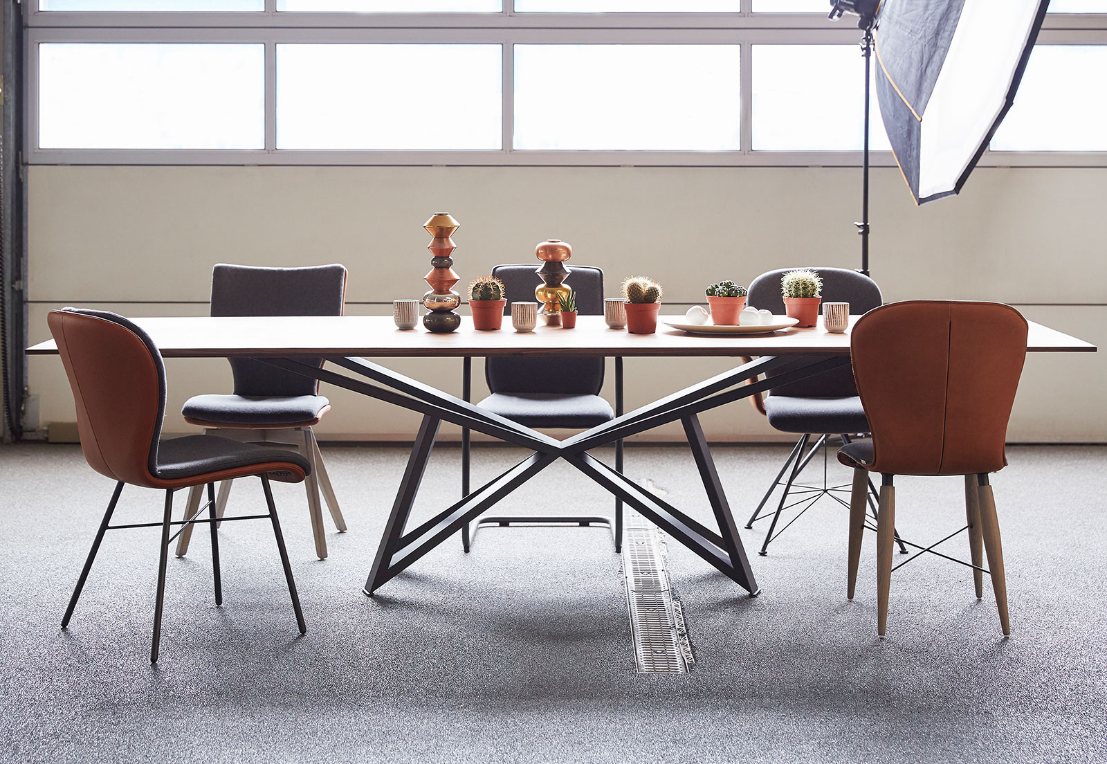 Design tafel Stella van Bert Plantagie kan niet anders dan stralen. Dit ware design meubel heeft een bijzonder blad waarbij de bladafwerking heel subtiel van buiten naar binnen is verjongd van 4 cm naar 1,2 cm. Blad leverbaar in diverse houtsoorten of in keramiek in verschillende maten Dit verfijnde blad is gekoppeld aan een magnifieke stalen kruispoot en vormt zo een echte eyecatcher! Deze opvallende pootconstructie is leverbaar in diverse kleuren.