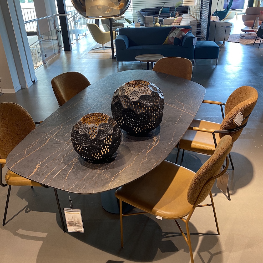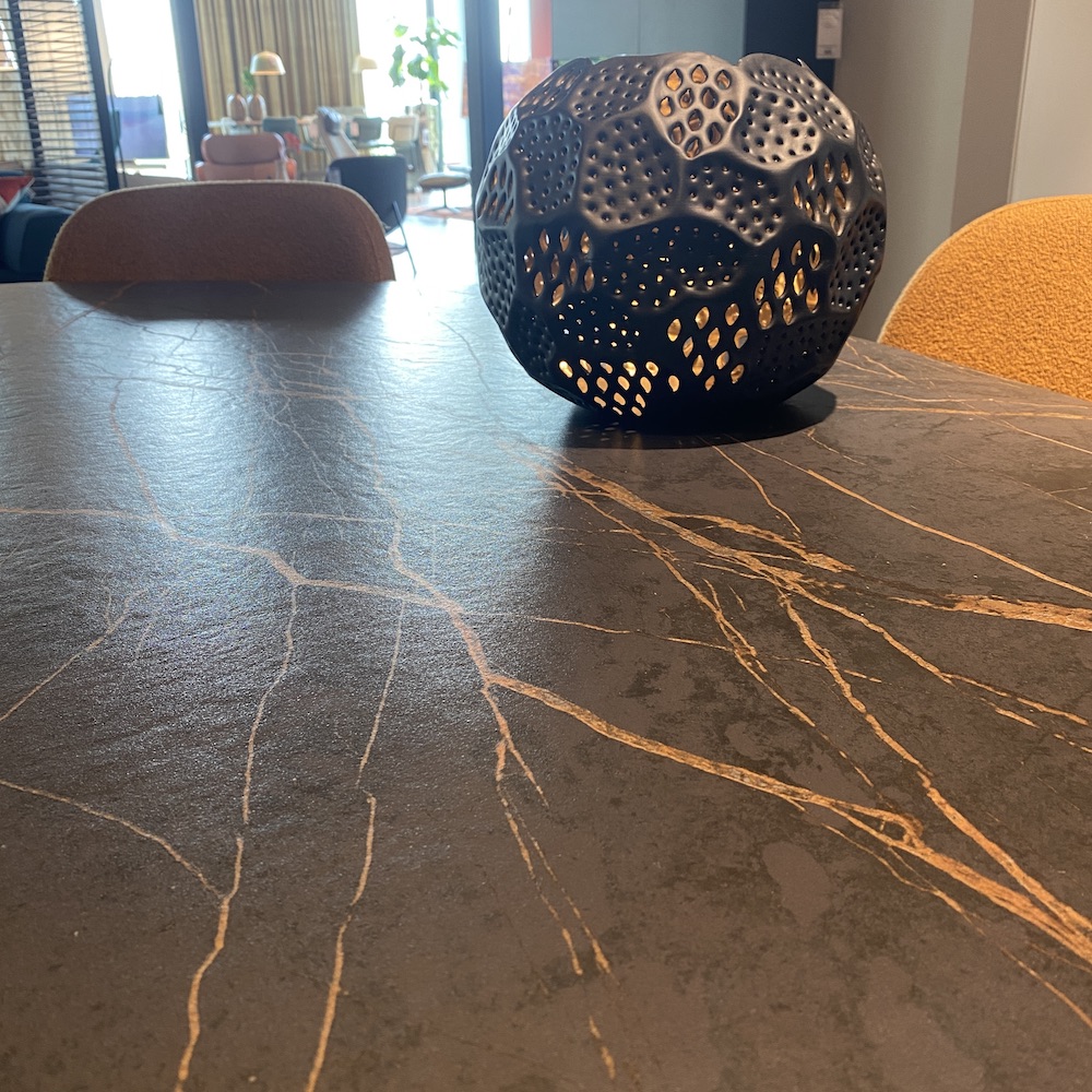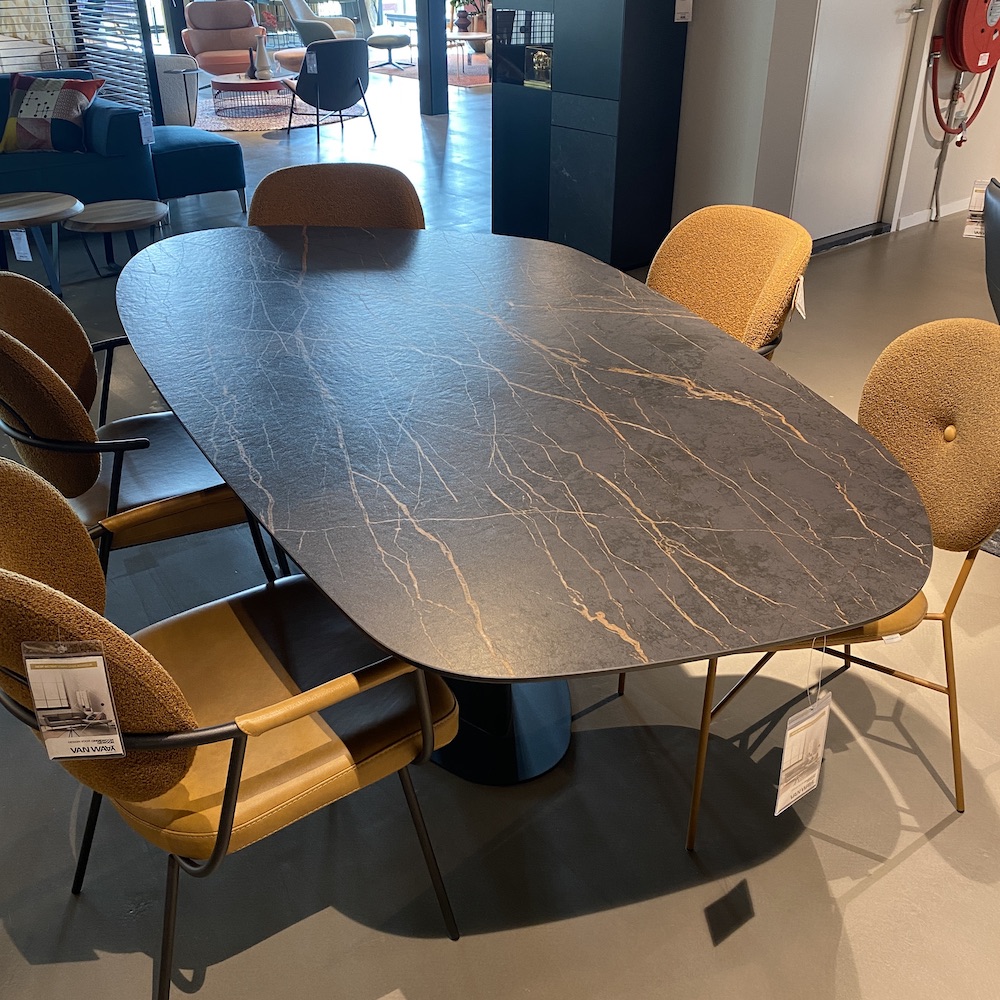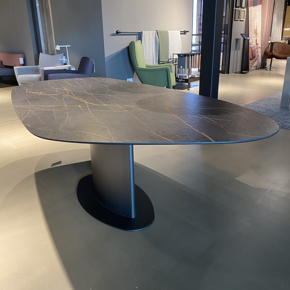 Deze Bert Plantagie Roman design tafel is te herkennen aan zijn organische vorm en nu al beroemd vanwege zijn vele mogelijke uitvoeringen. Dit Bert Plantagieoutlet showroommodel is een uitvoering in het robuuste dekton materiaal en heeftéén kolompoot.