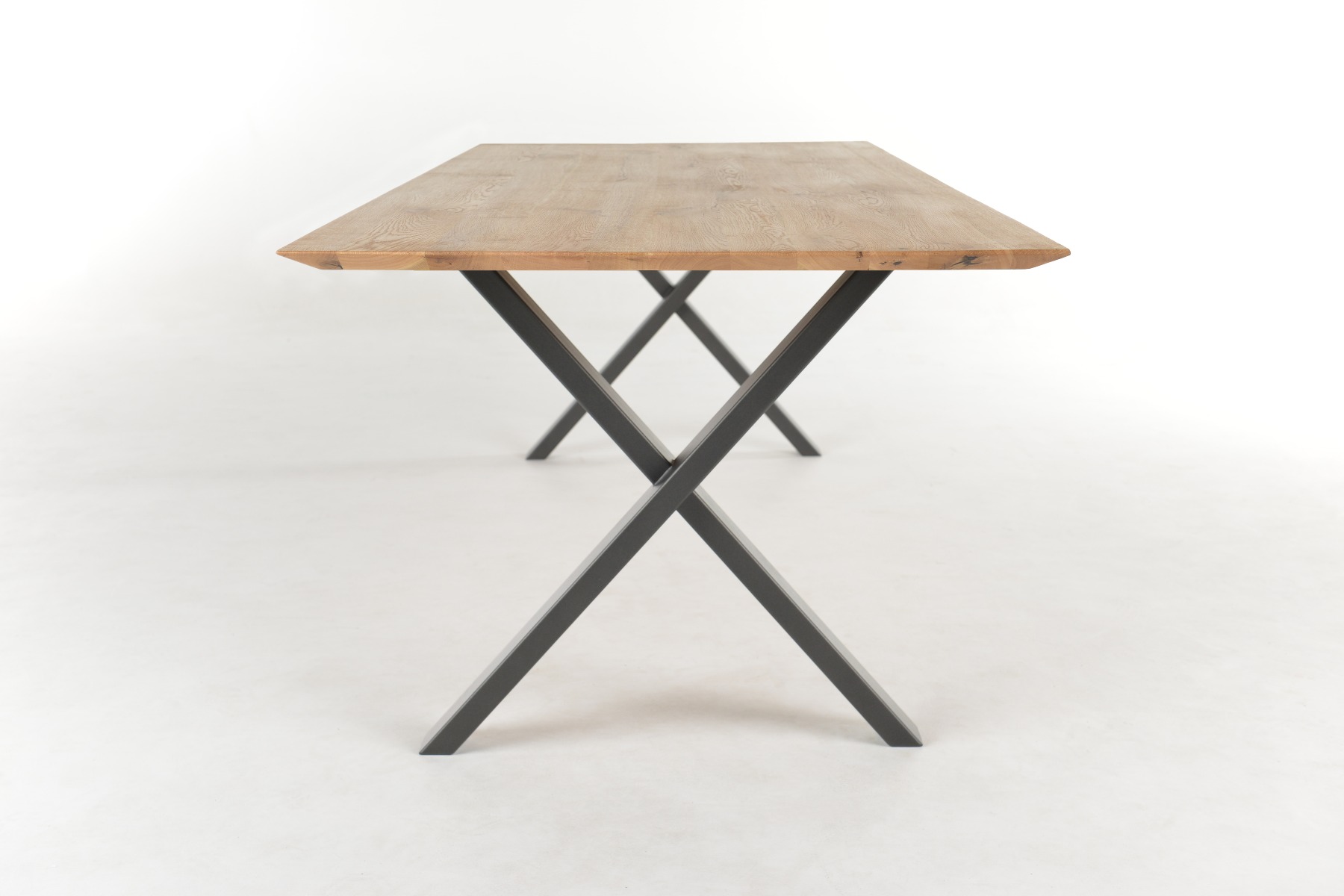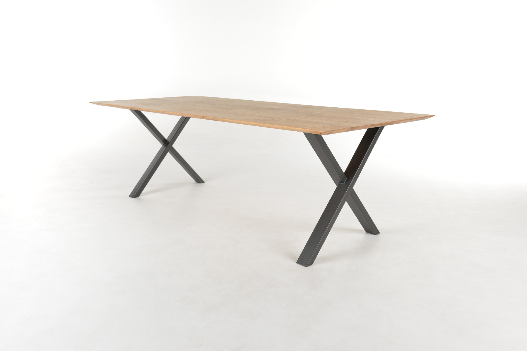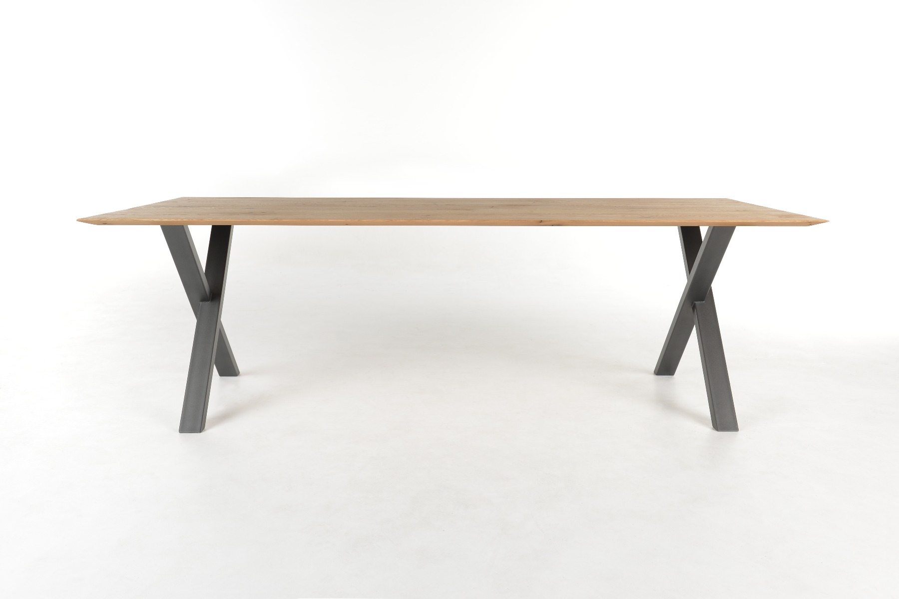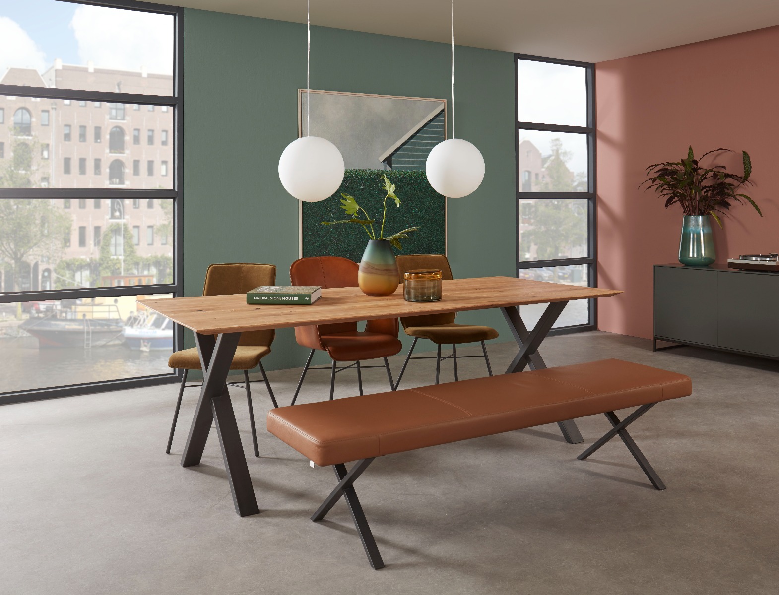 De design eettafel Xam uit de collectie van Bert Plantagie kenmerkt zich door een X-vormig onderstel en een verfijnd tafelblad. De design tafel is uitgevoerd met een houten tafelblad en wordt gedragen door een metalen onderstel. Deze combinatie zorgt voor een aangenaam aanzicht en een strakke vormgeving. Deze luchtige design tafel is met een bijpassende eetkamerbank ontwikkeld, die net als de tafel te herkennen is aan het X-vormige onderstel.