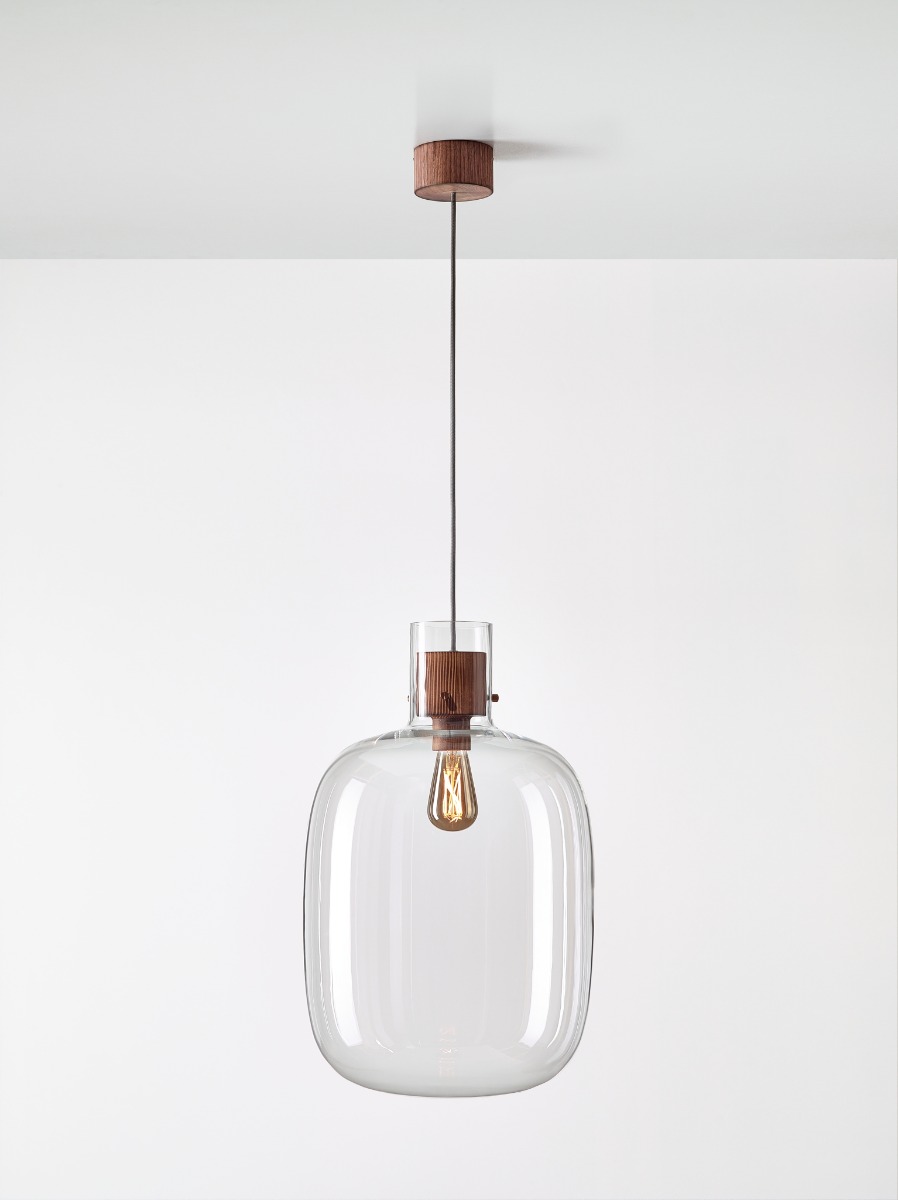 Awa is ontstaan uit het idee om verlichting te creëren die eruitziet als zacht glas dat na het opblazen zijn vorm heeft behouden. Ik hoop dat het de indruk wekt dat er een bal lucht zweeft als je omhoog kijkt. Een ander kenmerk van dit ontwerp is dat het hout en de metalen onderdelen van glas lijken te zijn, alsof het stoppers (kurken) voor de lucht zijn.