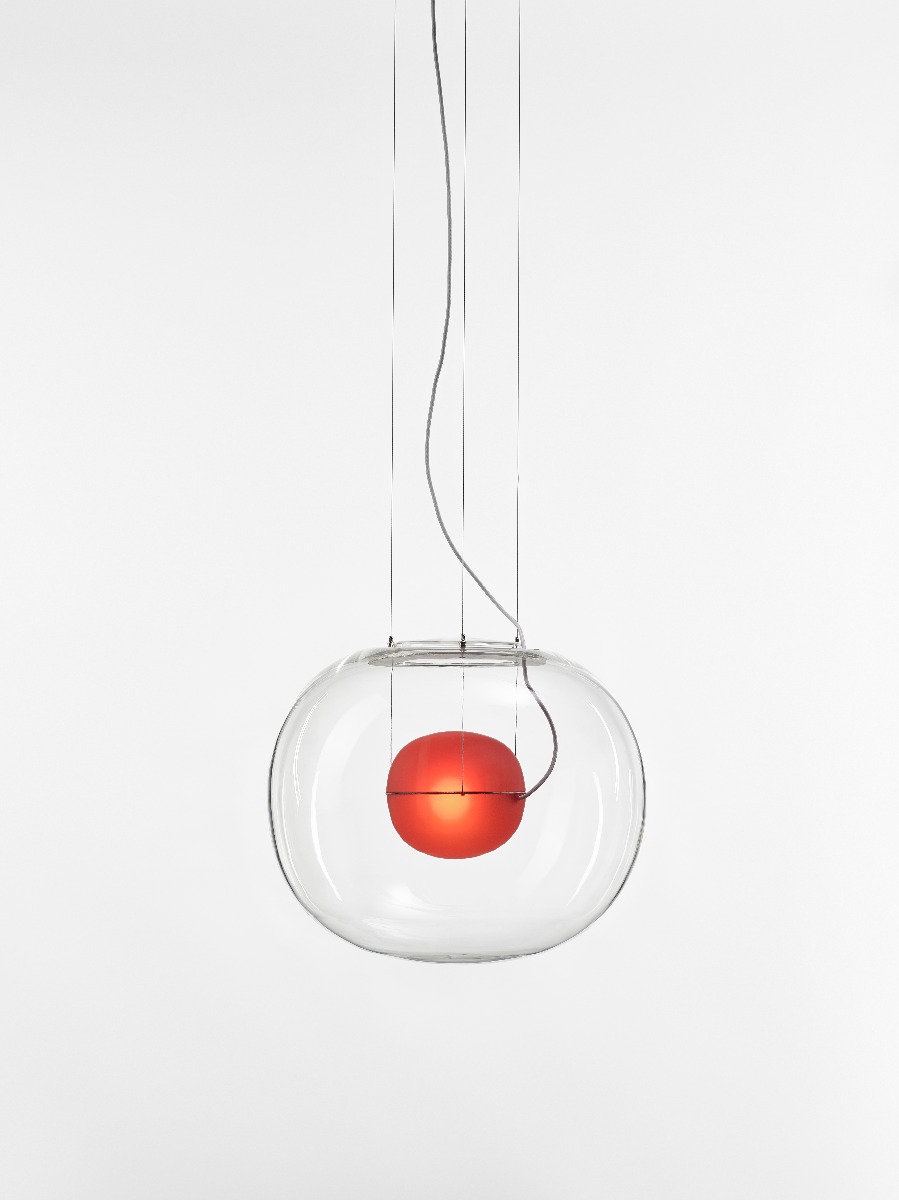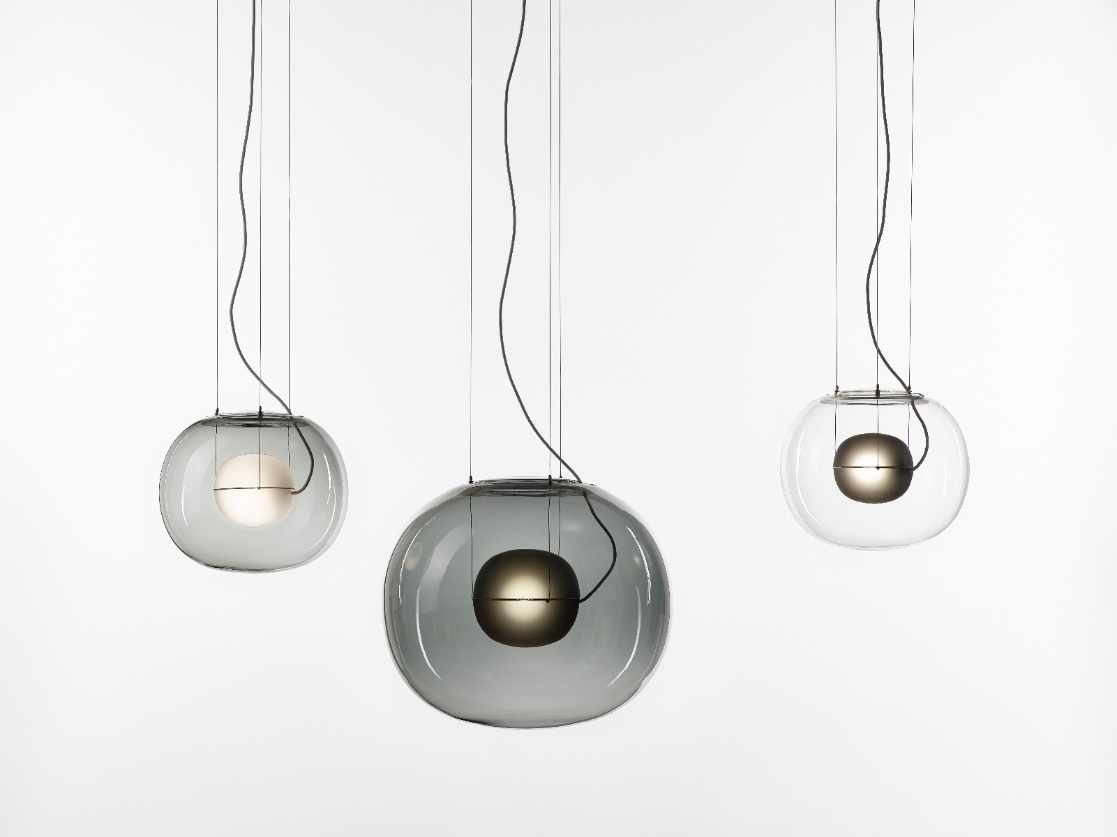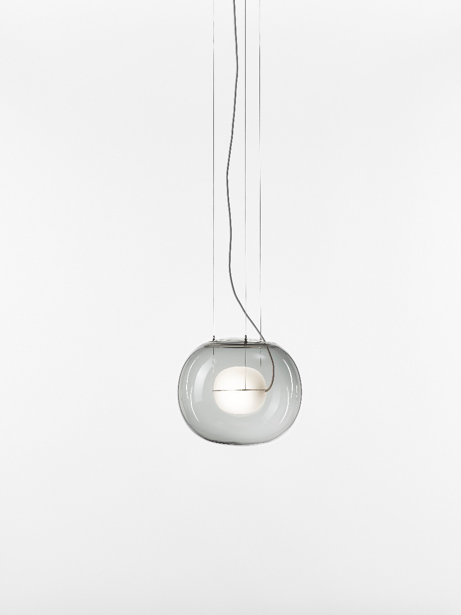 De Big One hanglamp van Lucie Koldova combineert poëzie en eenvoud met evenwichtige proporties, waarbij een zwevende “luchtbel” in het midden van de grote bol een gevoel van lichtheid creëert; het buitenste glas is glanzend in transparant of rookgrijs, het binnenglas mat in triplex opaal, rookgrijs, rood of lichtroze, en de collectie is verkrijgbaar in twee maten, met de getoonde prijs voor de Big One Small.