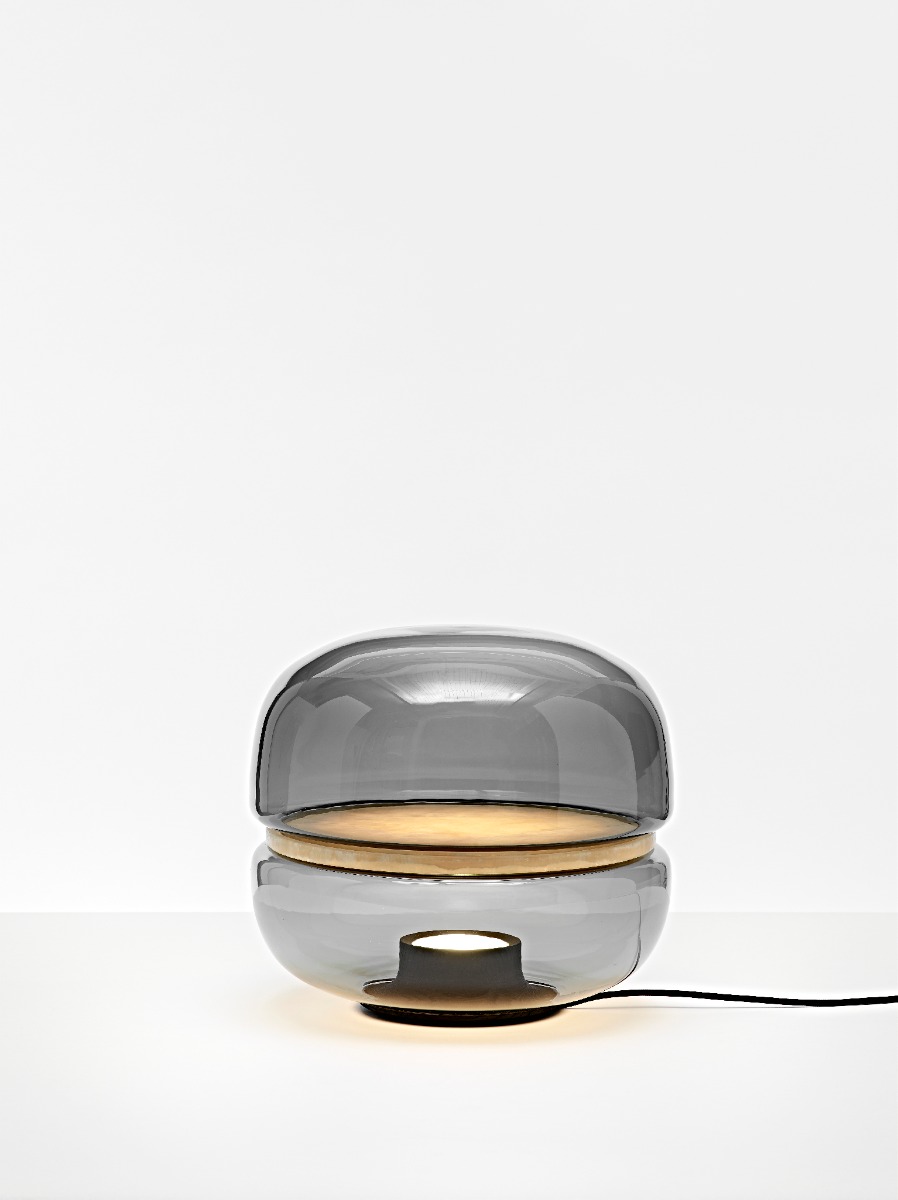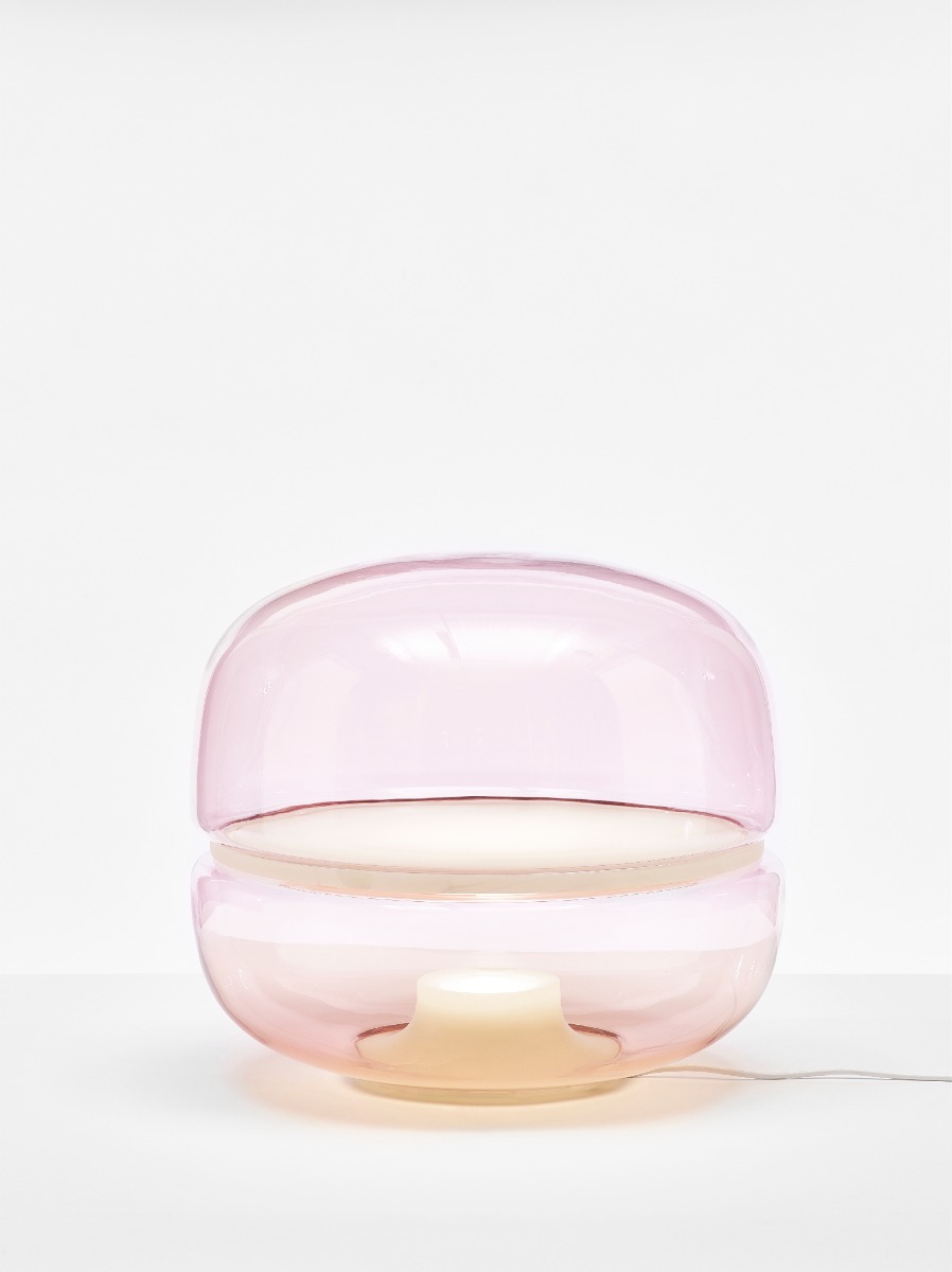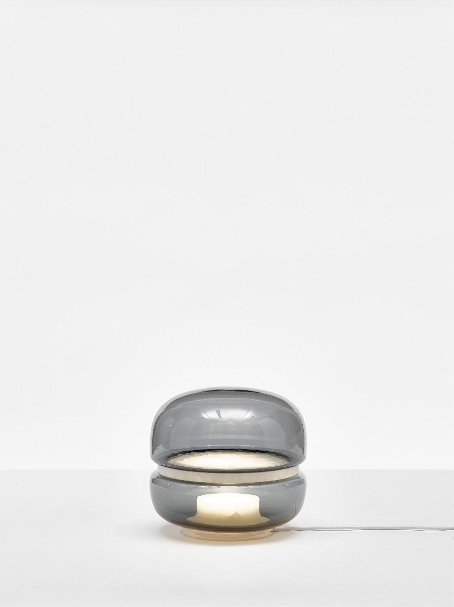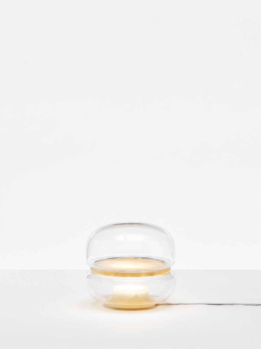 De Macaron-tafellamp is geïnspireerd op de kristallijne structuren van kyaniet en bestaat uit tegengestelde koepels van ambachtelijk geblazen glas, waardoor de steen als een zwevend maanlandschap oogt. Het ontwerp, vernoemd naar het Franse schuimgebakje, maakt elke lamp uniek door natuurlijke glasimperfecties en de variatie in steenstructuren. Verkrijgbaar in drie formaten, diverse glaskleuren en met wit of honing onyx; de grootste variant kan ook als vloerlamp dienen. Een alternatieve uitvoering combineert een middenplaat van gegoten glasscherven met een houten basis. De getoonde prijs is voor Macaron S.