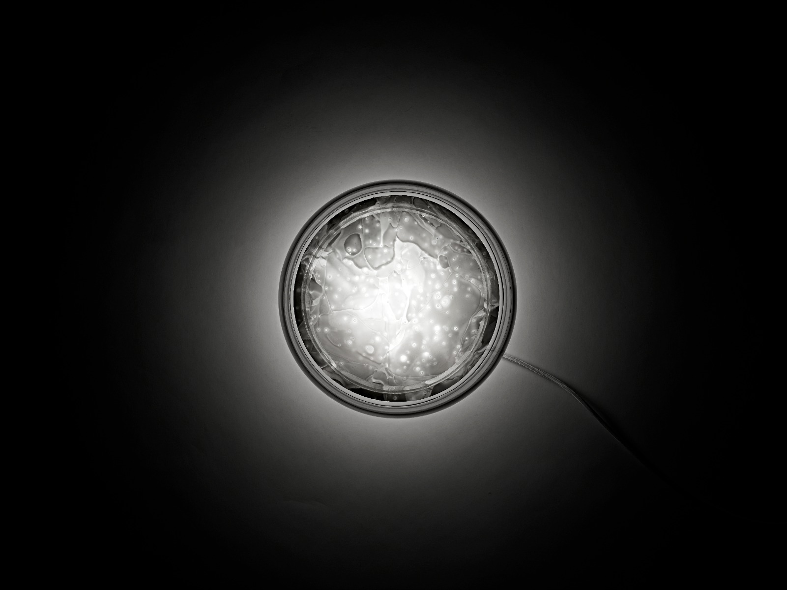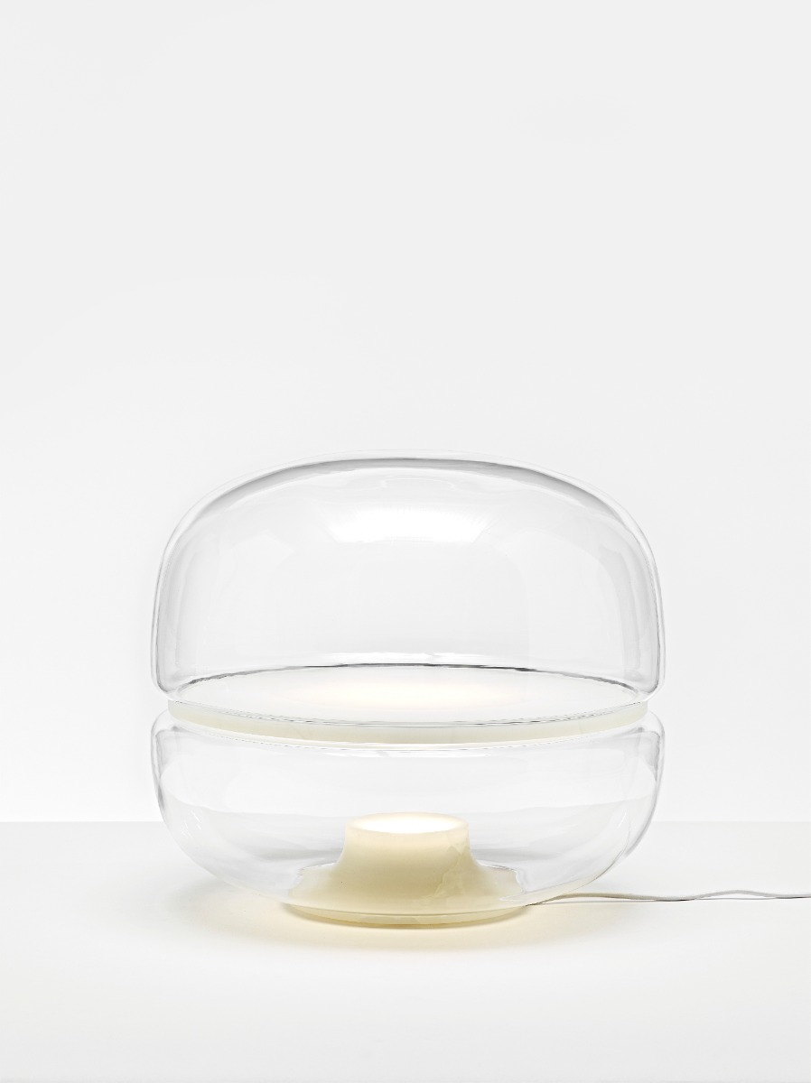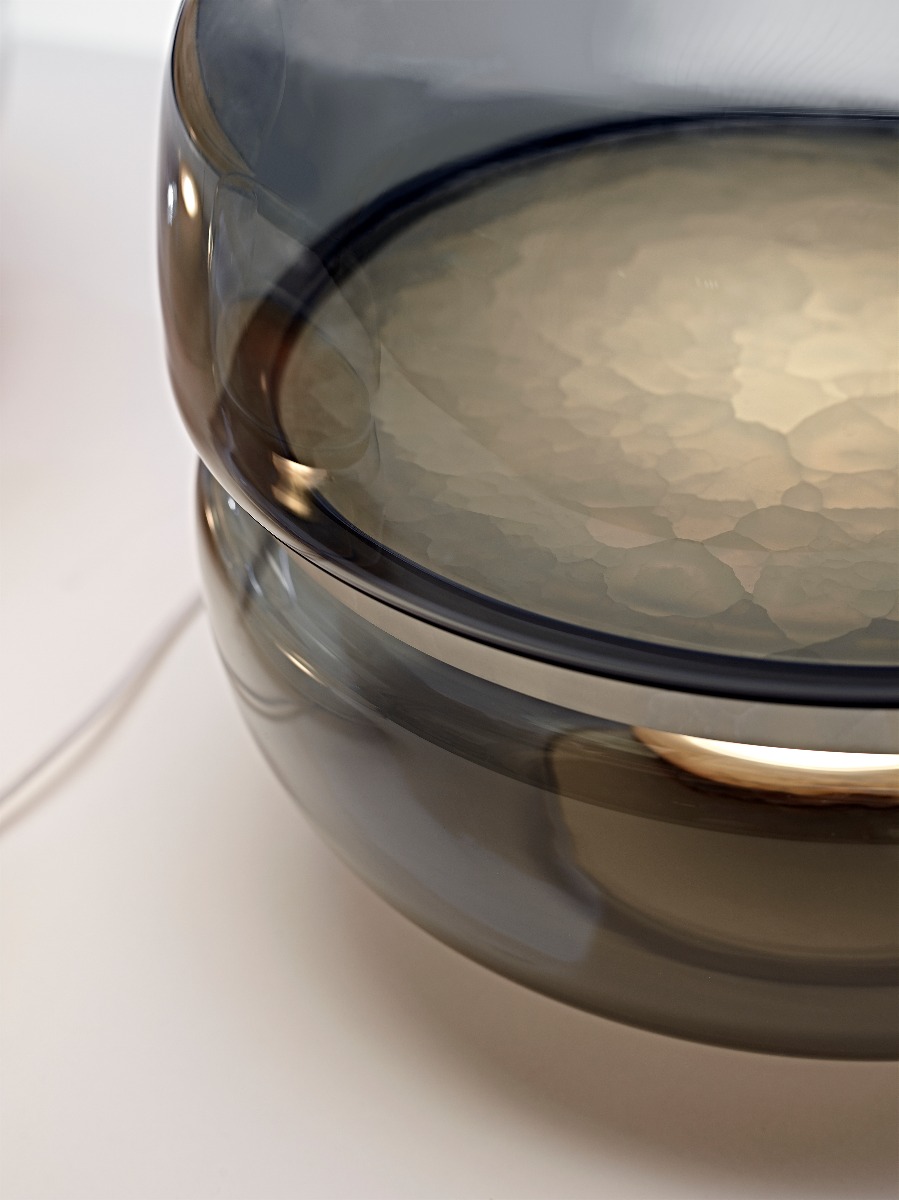 De Macaron-tafellamp is geïnspireerd op de kristallijne structuren van kyaniet en bestaat uit tegengestelde koepels van ambachtelijk geblazen glas, waardoor de steen als een zwevend maanlandschap oogt. Het ontwerp, vernoemd naar het Franse schuimgebakje, maakt elke lamp uniek door natuurlijke glasimperfecties en de variatie in steenstructuren. Verkrijgbaar in drie formaten, diverse glaskleuren en met wit of honing onyx; de grootste variant kan ook als vloerlamp dienen. Een alternatieve uitvoering combineert een middenplaat van gegoten glasscherven met een houten basis. De getoonde prijs is voor Macaron S.