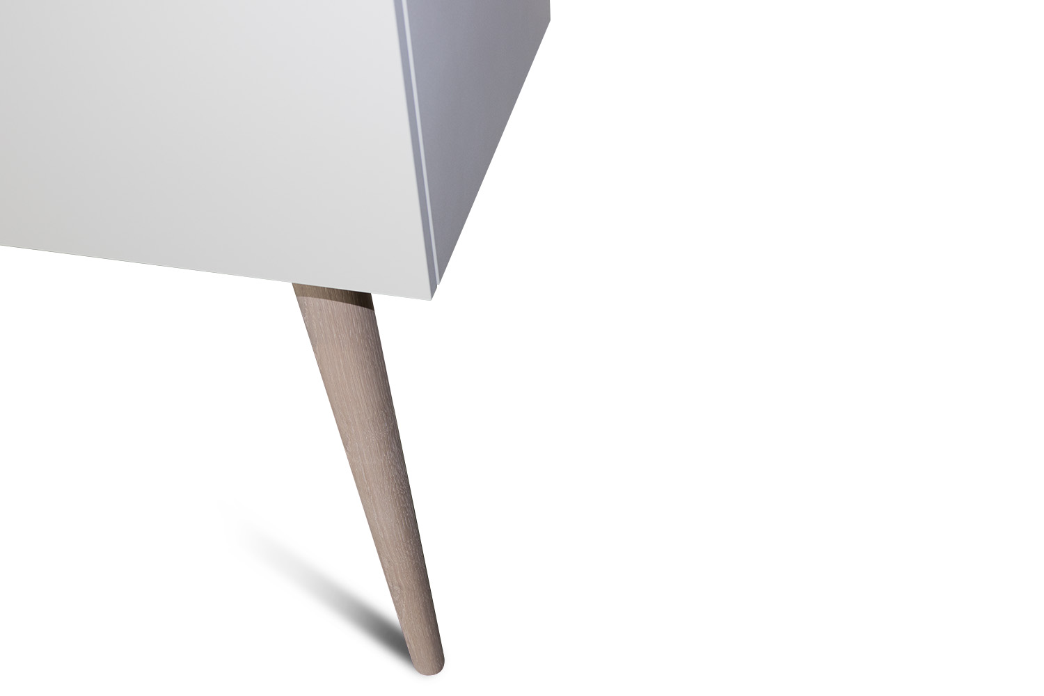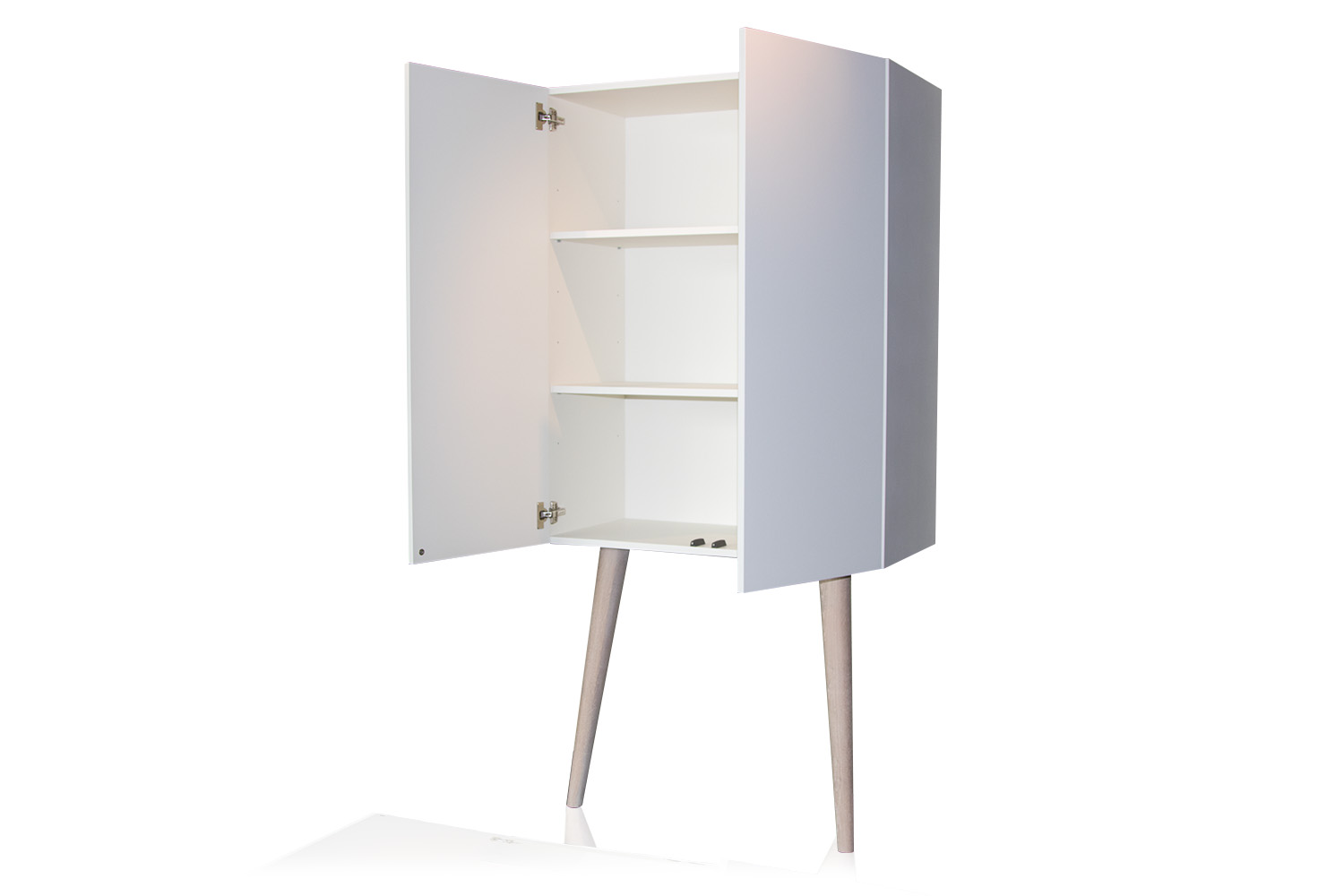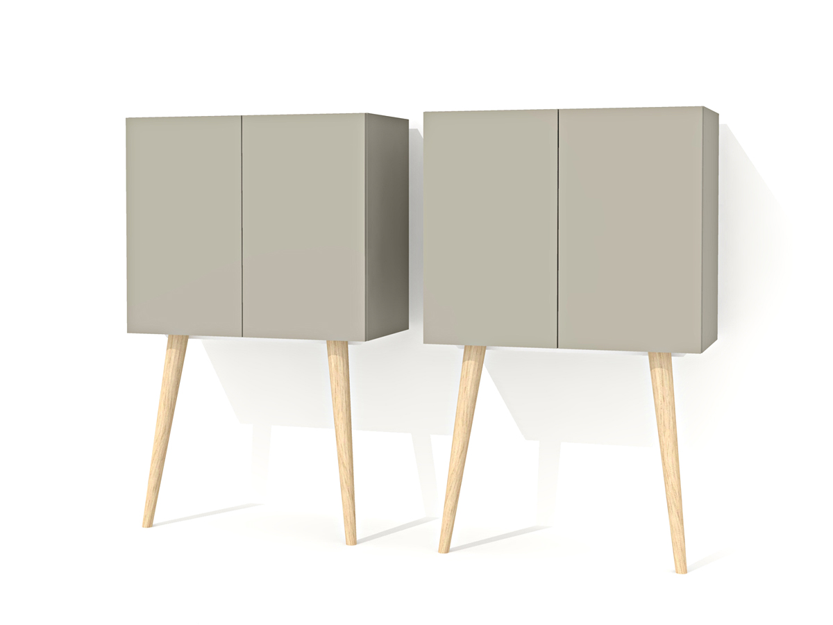 Een eigenwijs design wat direct opvalt door zijn hoge poten en het los leunen tegen de wand. Ingeboorde rubbers zorgen ervoor dat de poten niet wegschuiven en een viltstrip beschermd zowel de kast als de muur. Door de schuin geplaatste poten staan de leunkasten verrassend stabiel. Vastzetten aan de wand is dus helemaal niet nodig! De kasten zijn leverbaar in vele kleuren effectlak en de poten kunt u in diverse kleuren transparante olie bestellen.