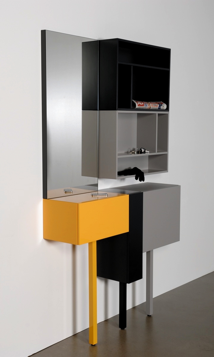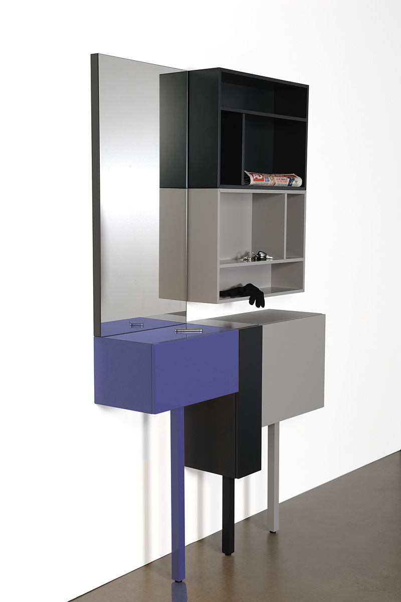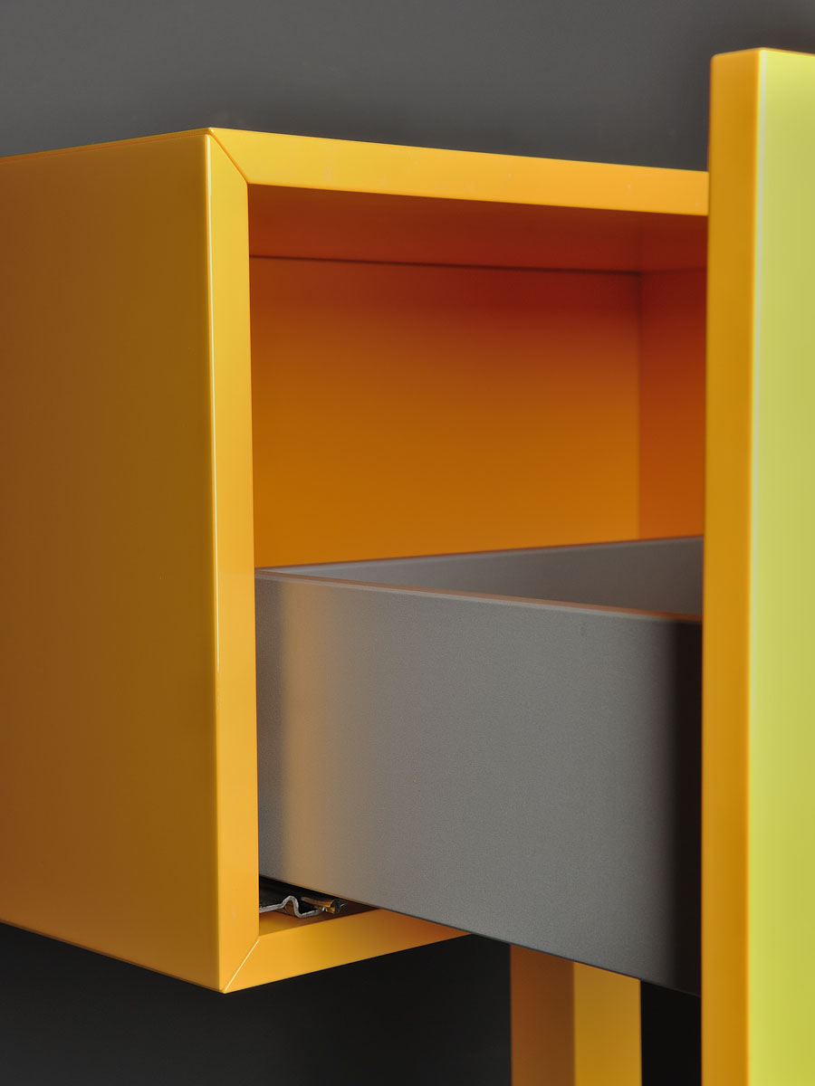 Eigenwijs balancerend op één poot zijn de Sticks kastjes op een rijtje, in een groepje of als enkel kastje in te zetten. Gerard de Hoop heeft ze in 4 breedte- en 4 hoogtematen en ook nog eens met 4 pootlengtes ontworpen, dus van nachtkastje tot torenkastje, van dressoir tot halkastje, de Sticks zijn overal toe te passen. En weer te veranderen, want Sticks wordt enkel aan de achterzijde aan de wand gemonteerd en is dus elk kastje is altijd elders weer herbruikbaar.