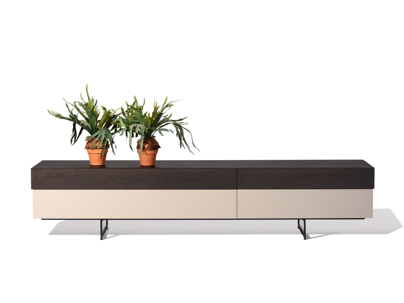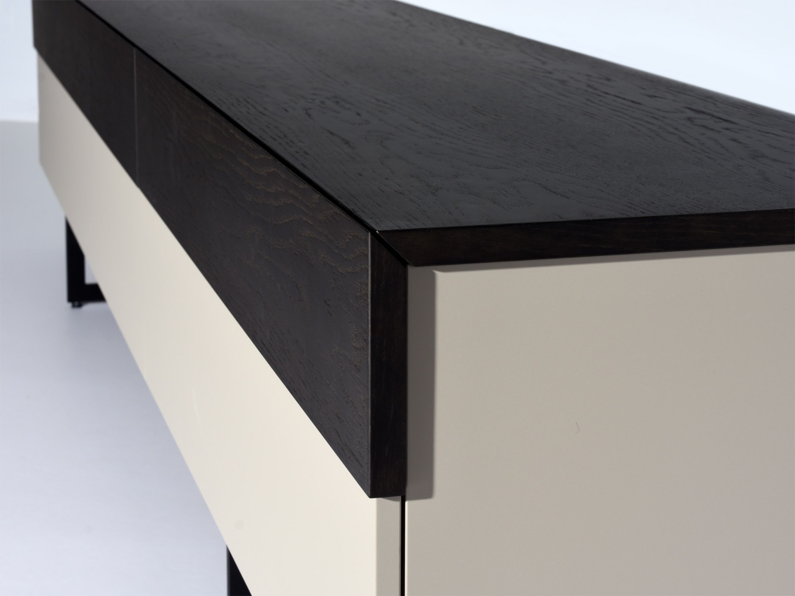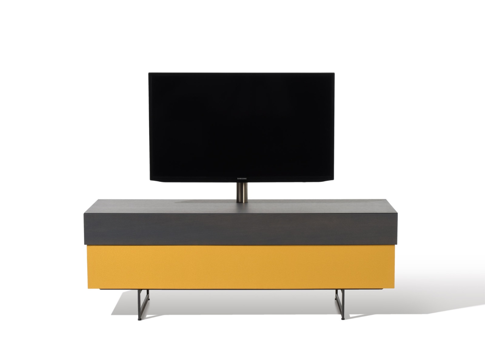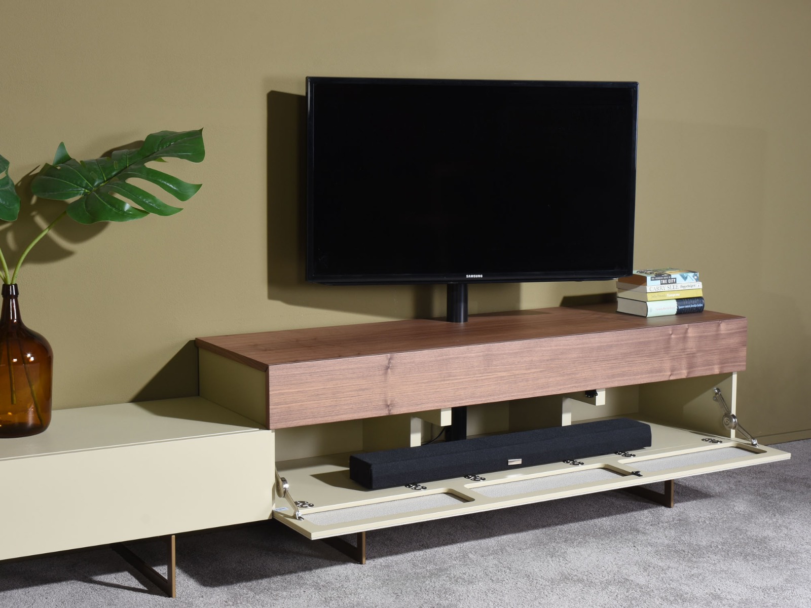 Het Tapa lowboard heeft een uniek design met een bovenblad en frontstrook in verstek, wat een luxe uitstraling geeft. Het “deksel” wordt benadrukt door een dikkere afwerking en subtiel overstek. Standaard voorzien van bekabeling, geschikt als mediameubel. Opties: lade, draaibare TV-paal, speakerstof, wandmontage of slanke pootjes.
