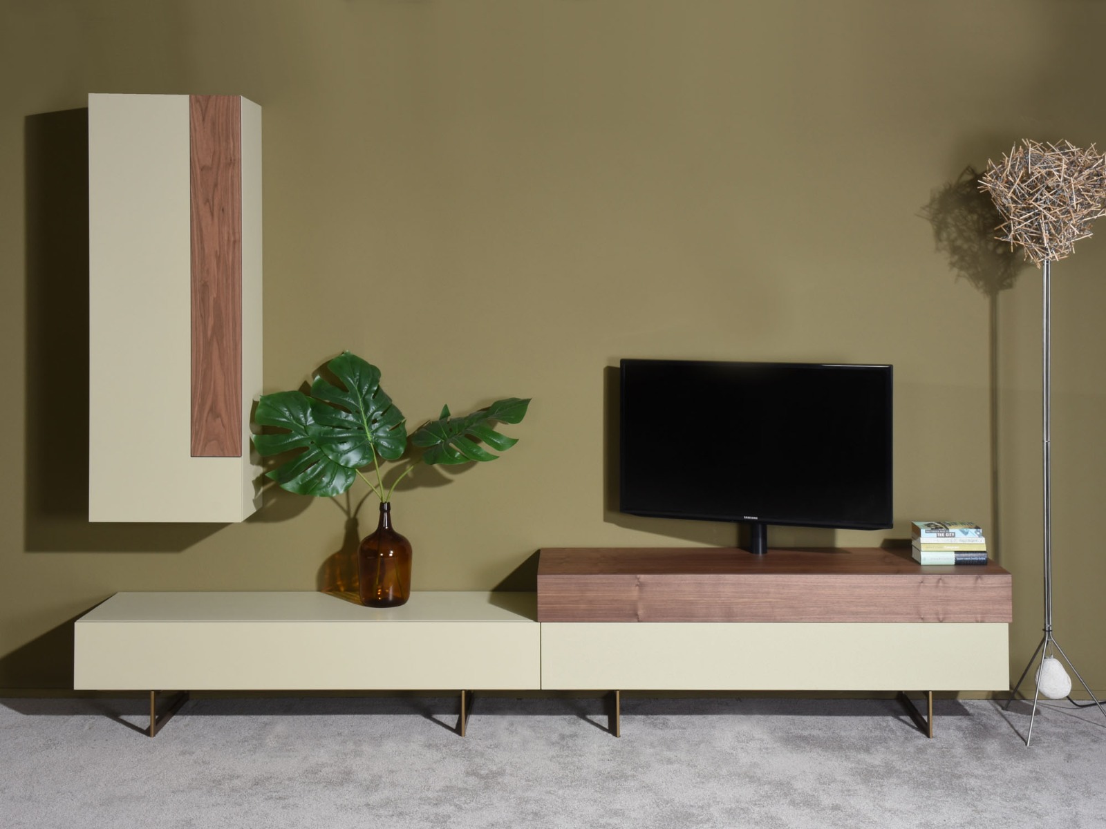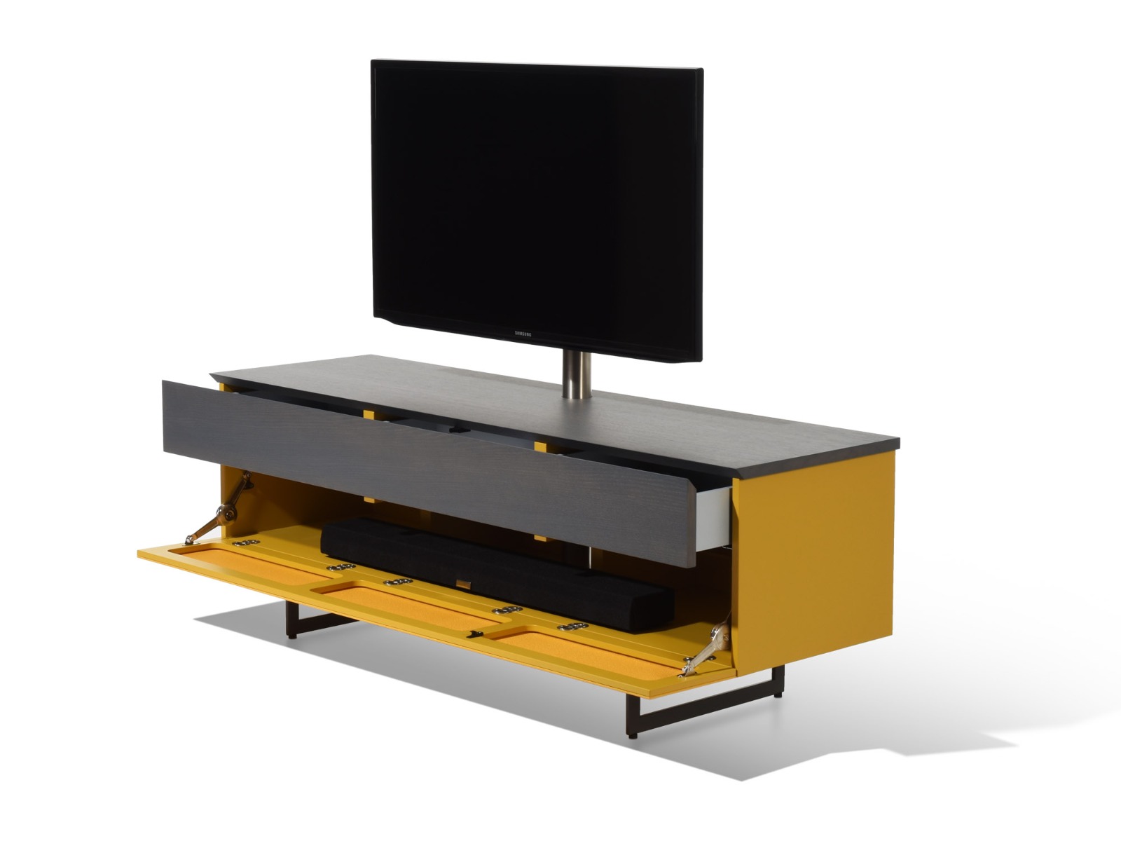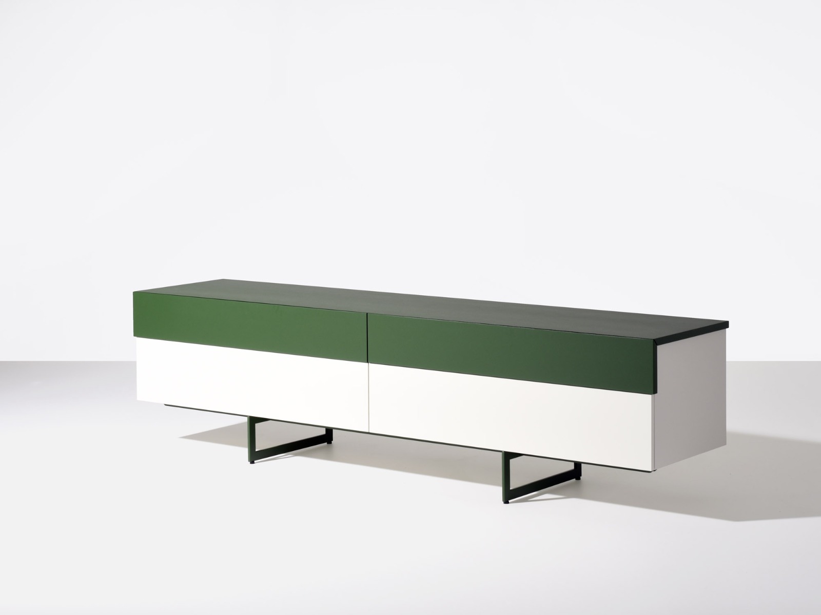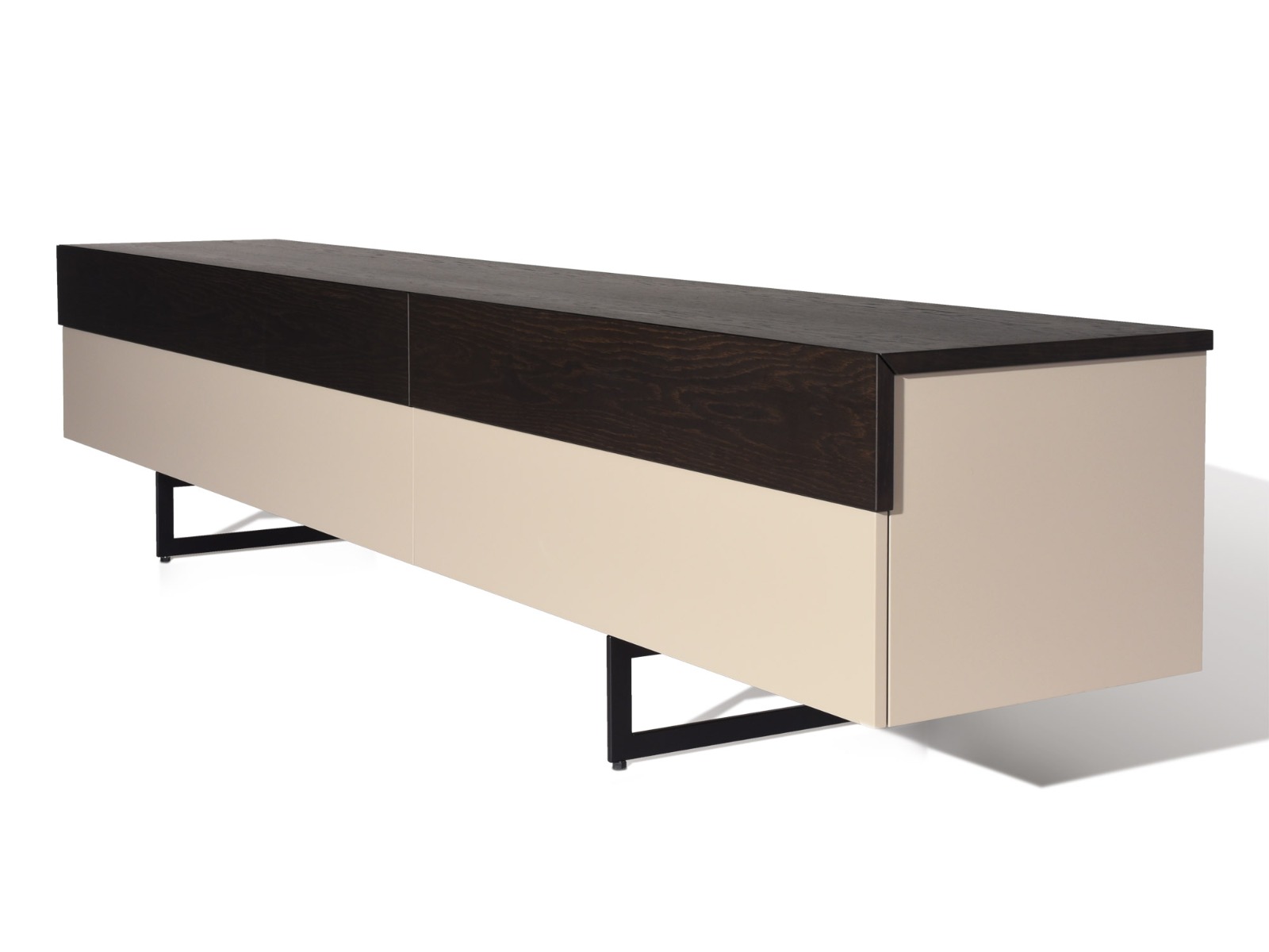 Het Tapa lowboard heeft een uniek design met een bovenblad en frontstrook in verstek, wat een luxe uitstraling geeft. Het “deksel” wordt benadrukt door een dikkere afwerking en subtiel overstek. Standaard voorzien van bekabeling, geschikt als mediameubel. Opties: lade, draaibare TV-paal, speakerstof, wandmontage of slanke pootjes.