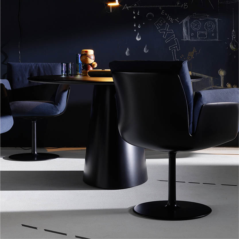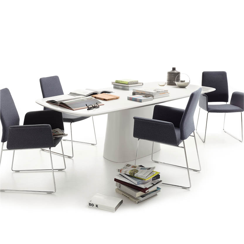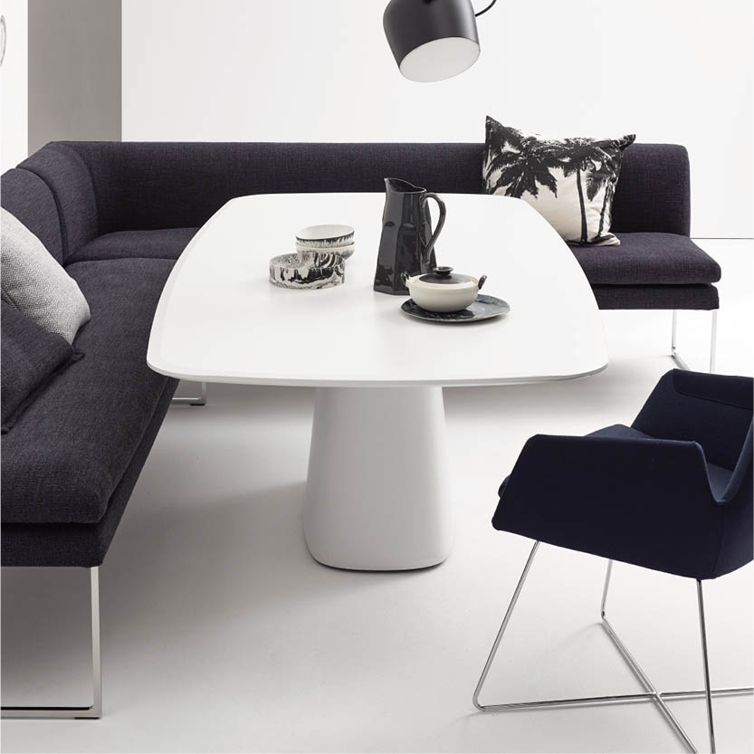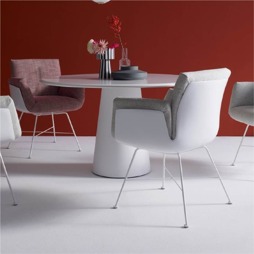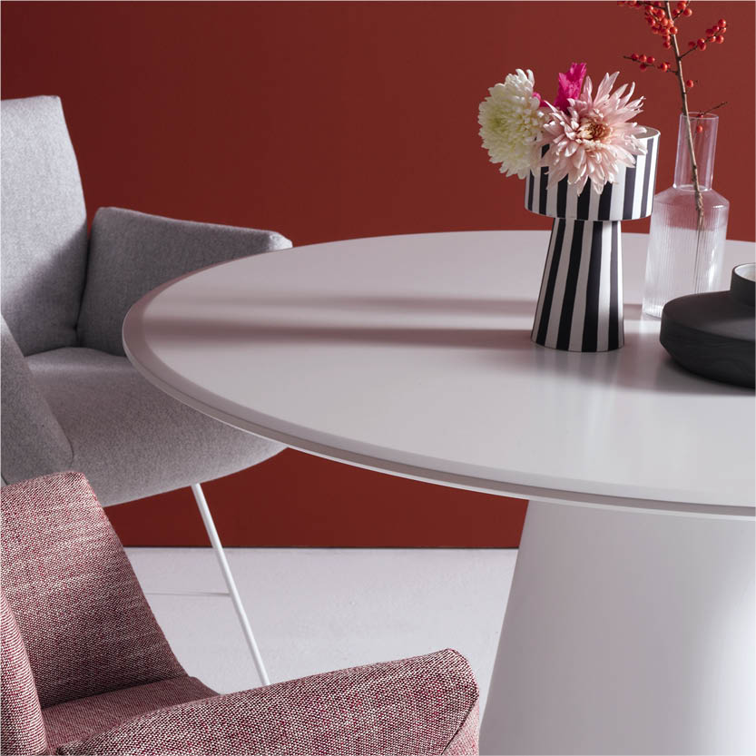 De Conic tafel van COR is met zijn charmante geometrische basisvormen altijd een ideale basis voor een unieke eethoek. Het ronde, ovale of rechthoekige blad is verkrijgbaar in natuurlijke materialen zoals massief geolied hout, natuurlijk eiken, walnoot, essen, kalksteen, marmer of serpentiniet en een MDF-blad in COR lak-/poederlakkleuren of wit mat mineraal materiaal.