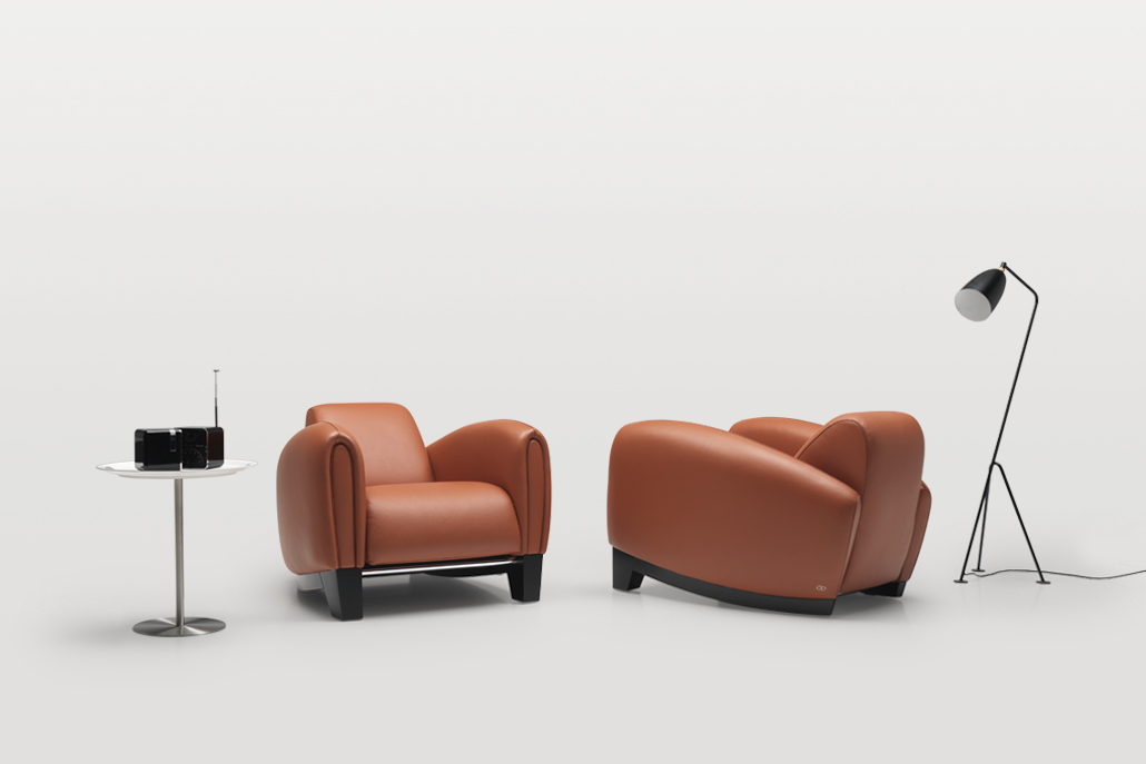 Een enkel stuk in een volledig gestroomlijnde vorm: Het ontwerp en de zitcomfort doen denken aan een 1930 racewagen. De steile helling van de zitting wordt bereikt door het gebruik van een wigvormige basis – in stootvast hoogglans lak , gelakt massief eiken of aluminium. Dit model is ook verkrijgbaar met een geïntegreerde, in hoogte verstelbare hoofdsteun.
