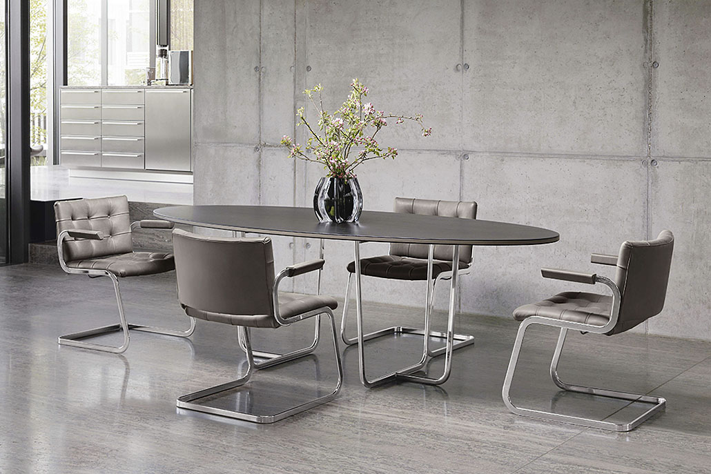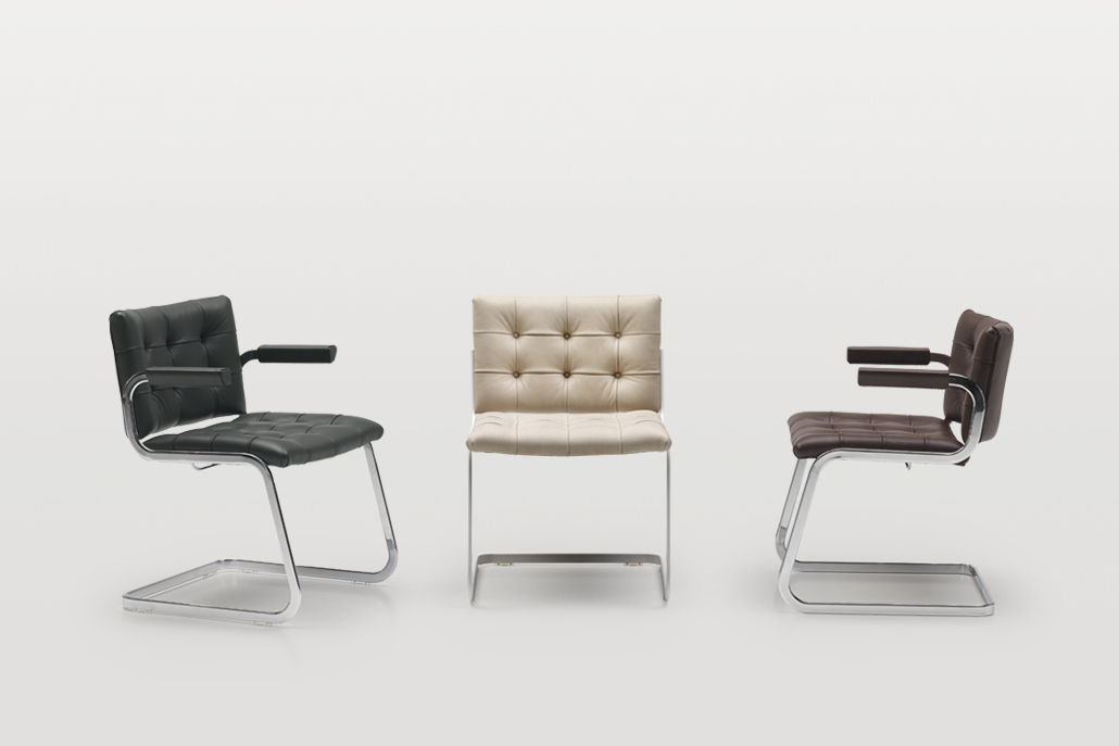 Een stoel die niets van zijn elegantie en stijl heeft verloren sinds de oprichting in de jaren 1950 – een pictogram. De heruitgave blijft een klassieker, maar is enigszins aangepast aan de moderne eisen met een iets slanker gestoffeerde oppervlak, een aangepaste zithoogte en een frame dat is aangepast aan de nieuwe eisen om ssnmoderne behoeften te voldoen. Ook verkrijgbaar met of zonder armleuningen.