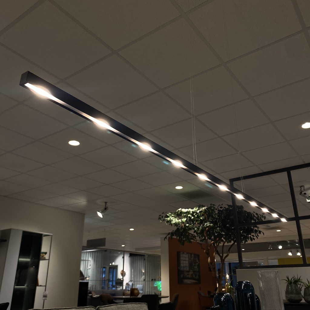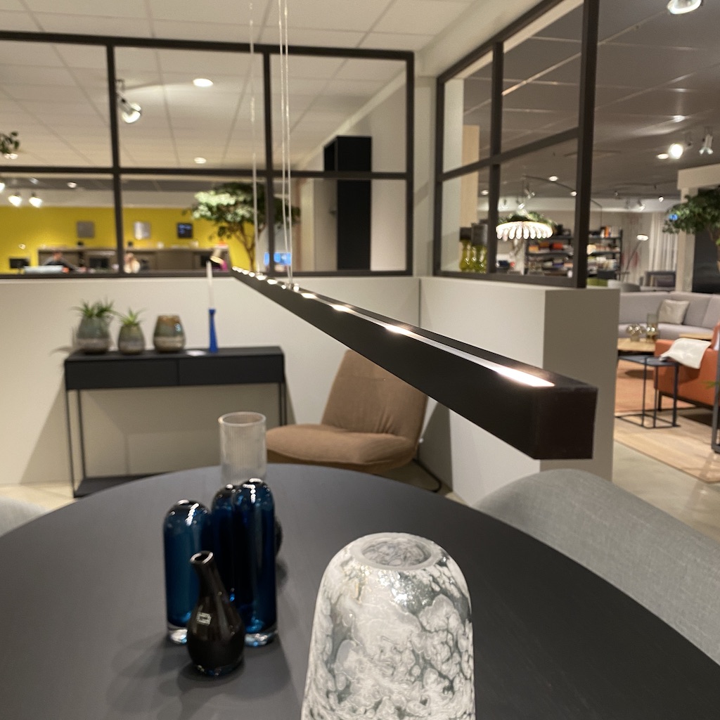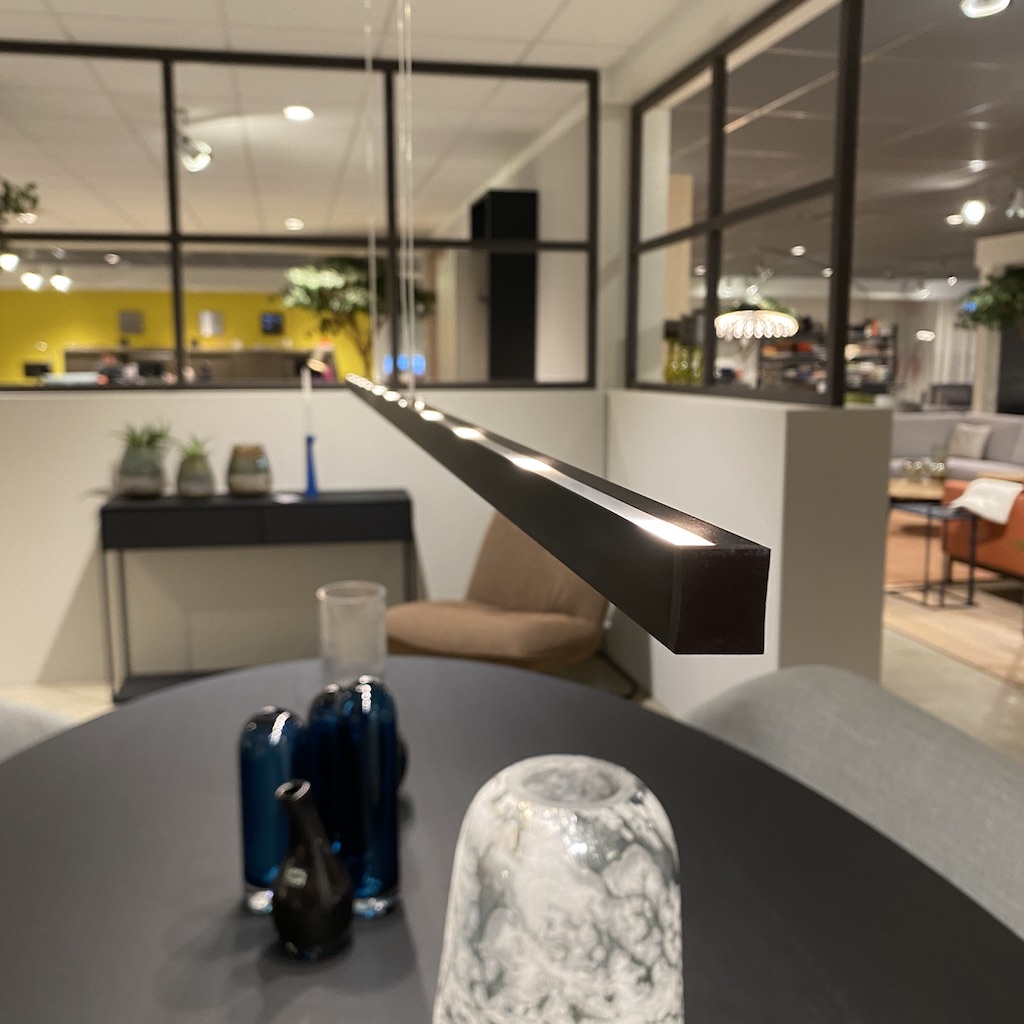 De Ferrolight Sunsister, het ‘zusje van de zon’, is een design hanglamp met afzonderlijk dimbaar up- en downlight. Sfeer en functioneel licht in één armatuur. Showroommodel, 160 cm breed, uitgevoerd in zwart en inclusief afstandsdimmer.