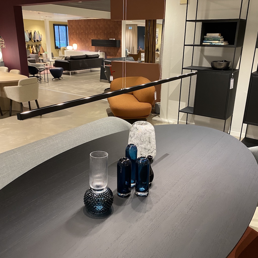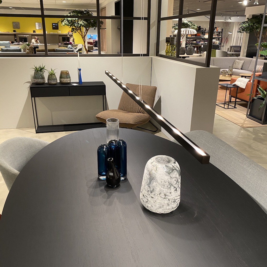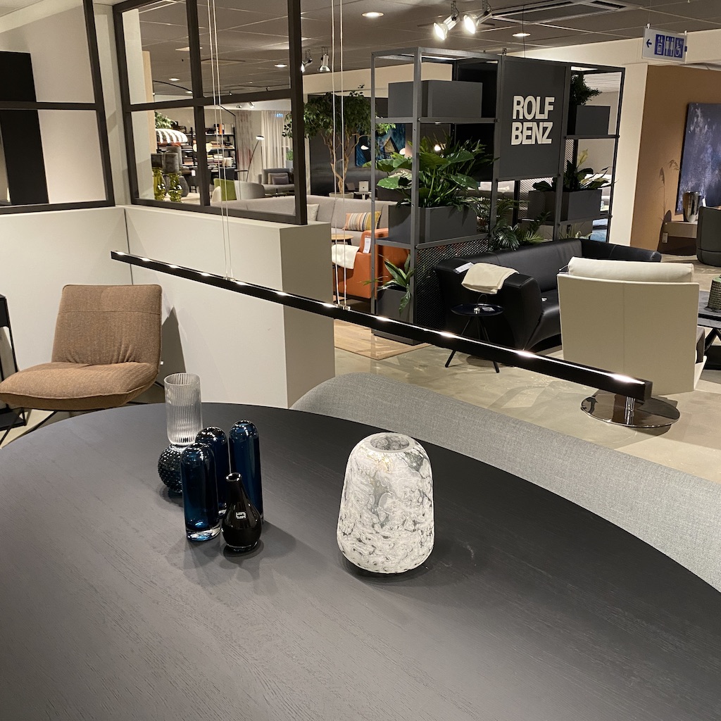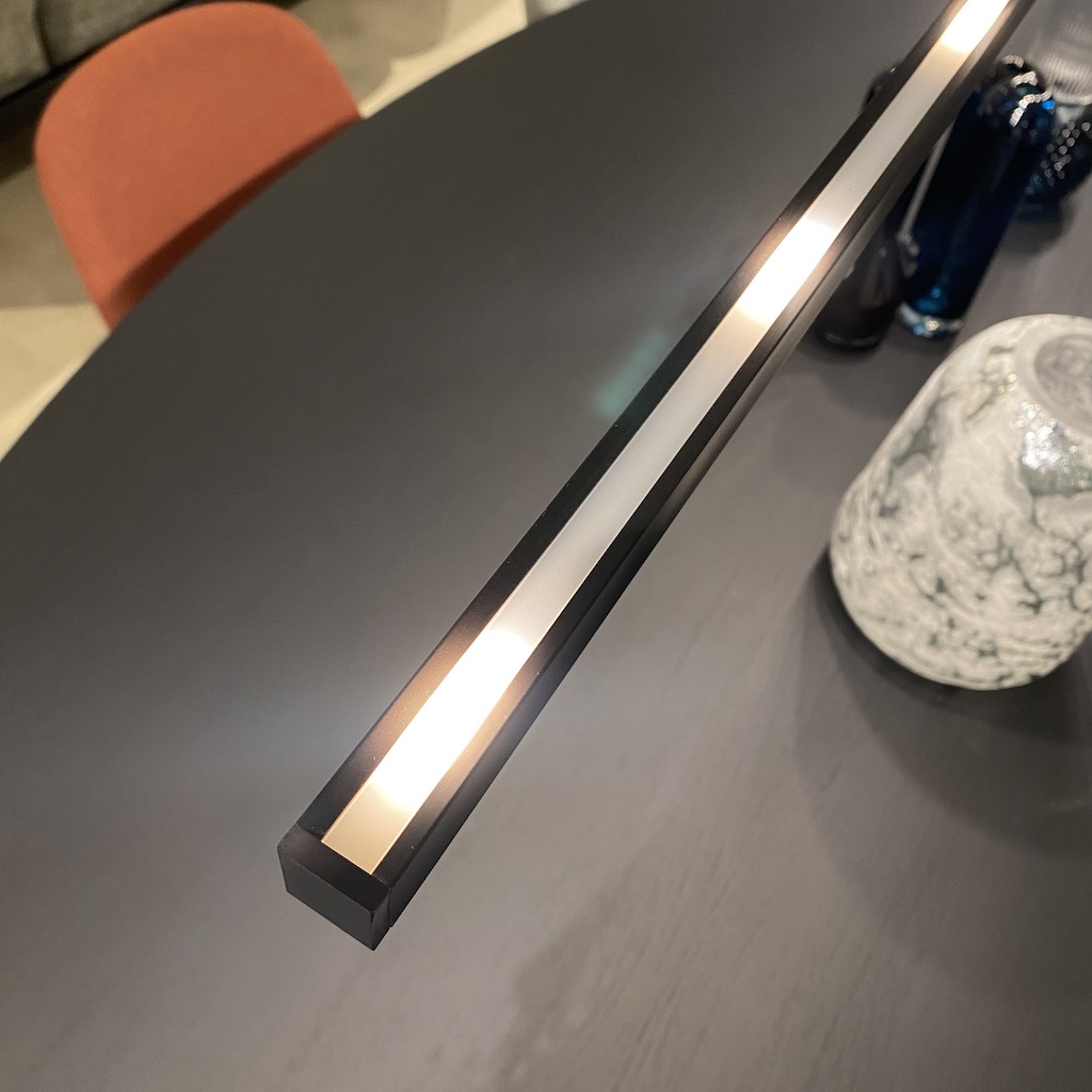 De Ferrolight Sunsister, het ‘zusje van de zon’, is een design hanglamp met afzonderlijk dimbaar up- en downlight. Sfeer en functioneel licht in één armatuur. Showroommodel, 160 cm breed, uitgevoerd in zwart en inclusief afstandsdimmer.