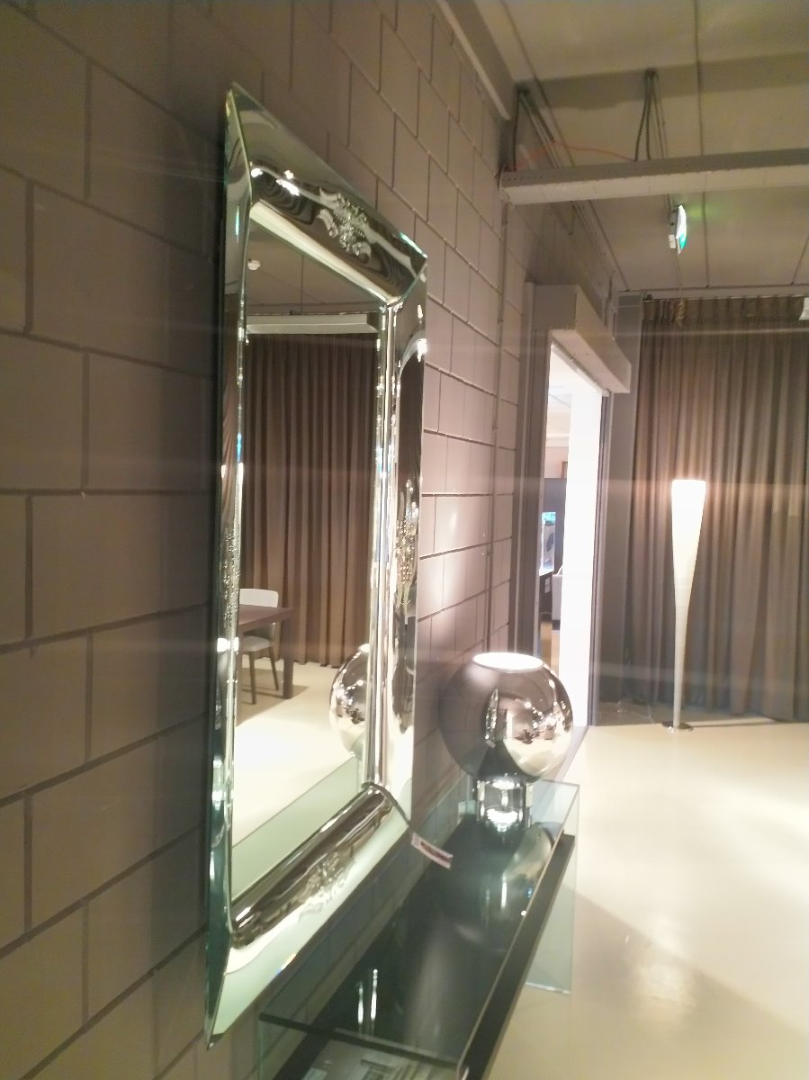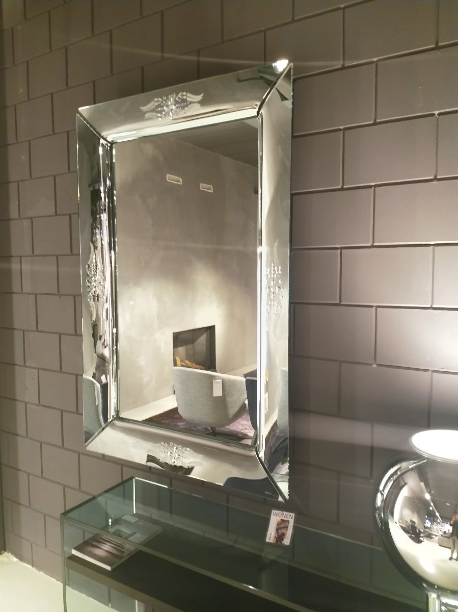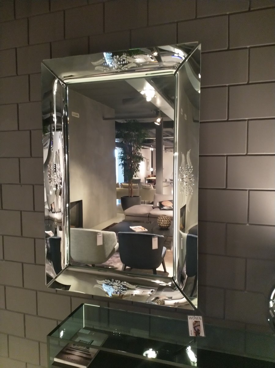 Fiam spiegel model Caadre. Type 632 met gegraveerde lijst. Afmeting 150 x 105 cm.