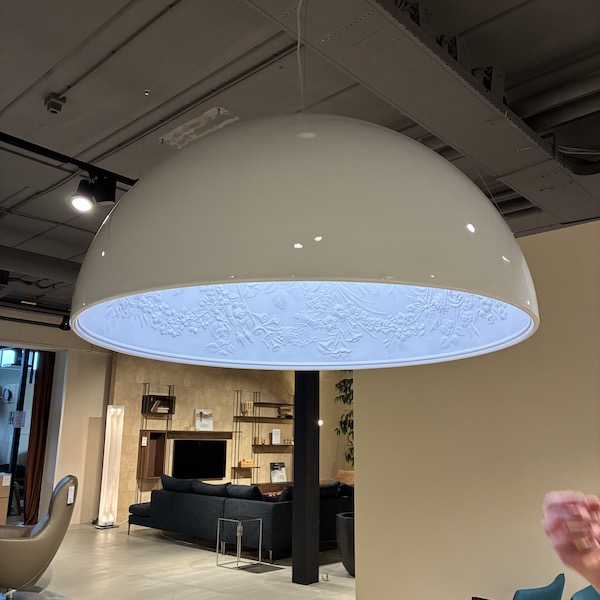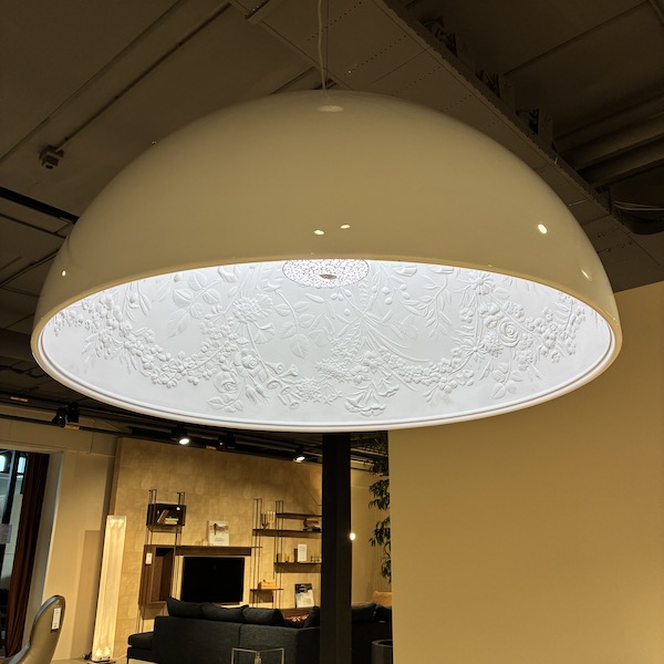 De Skygarden 2 van Flos is niet zomaar een lamp, het is een stukje kunst aan het plafond. Aan de buitenkant ziet u een strakke, glanzend witte schaal, maar wie onder de lamp kijkt, ontdekt een prachtig geheim: een sierlijke ’tuin in de lucht’ vol verfijnde bladeren en ornamenten.