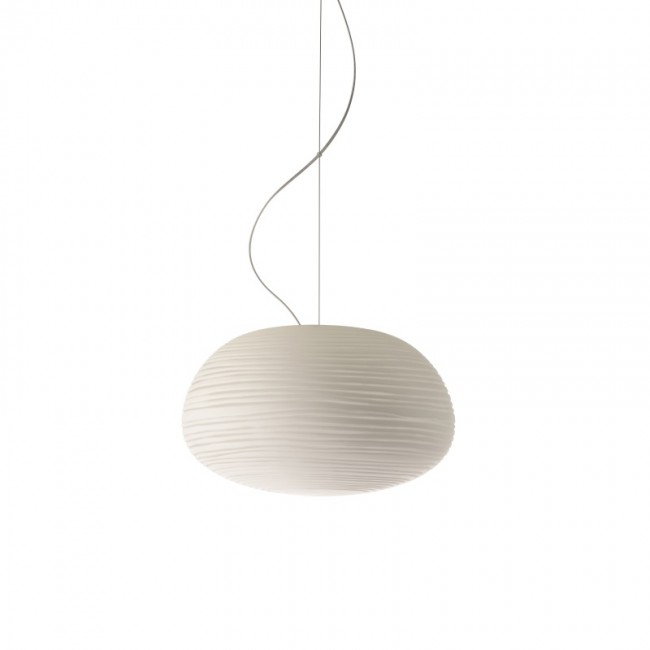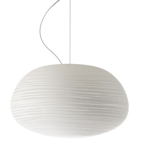 De Rituals 2 hanglamp van Foscarini combineert elegant glas met een subtiel streeppatroon, geïnspireerd op Japanse Washi-lantaarns. Diameter 34 cm, hoogte 19 cm, snoer 190 cm. Baldakijn 12 cm, E27 fitting voor max. 15W LED of Fluorescent. Gemaakt van geblazen satijnglas en gelakt metaal, gewicht 4 kg. Prachtig alleen of in combinatie met Rituals 1 en 3.