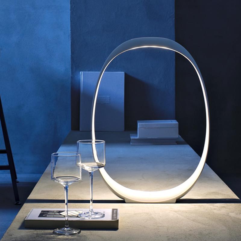 De Anisha tafellamp LED heeft de vorm van een onregelmatige ellips. Deze omarmt als het ware de ruimte waarover zij haar licht laat schijnen. In de bianco ofwel witte uitvoering valt Anisha samen met de ruimte waar ze staat. In de rosso, rode, versie valt de lamp des te meer op. Door de Anisha tafellamp LED van Foscarini aan te raken, dim je het licht. Zowel aan als uit is het een bijzonder element in de woon- of slaapkamer, in de hal of op de werkplek.