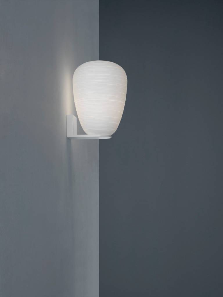 De Foscarini Rituals 1 wandlamp trekt ook uitgeschakeld de aandacht. Geïnspireerd op Oosterse papieren lantaarns en uitgevoerd in Venetiaans glas, combineert hij een elegant uiterlijk met subtiel, verspreid licht. De kap is 24 cm in diameter, 34 cm hoog en hangt aan een voet van gelakt metaal; de diepte inclusief armatuur is 26 cm. De witte kap zorgt voor een zacht licht en kan zowel bovenop de voet als hangend gemonteerd worden. Voorzien van een E27-fitting en exclusief lichtbron, een eyecatcher voor elke wand.