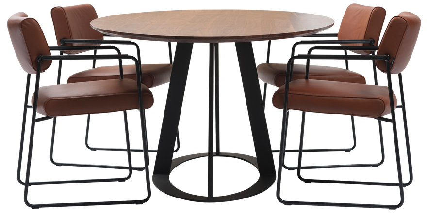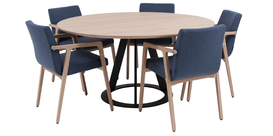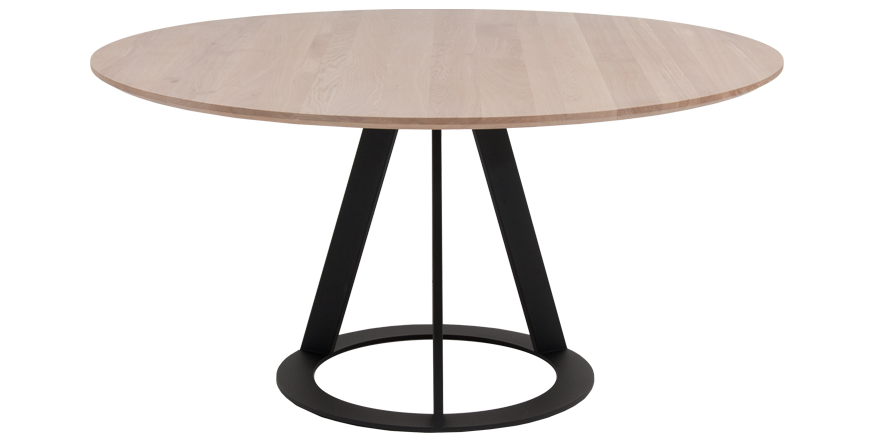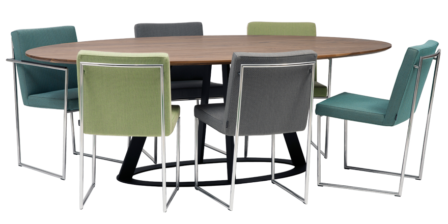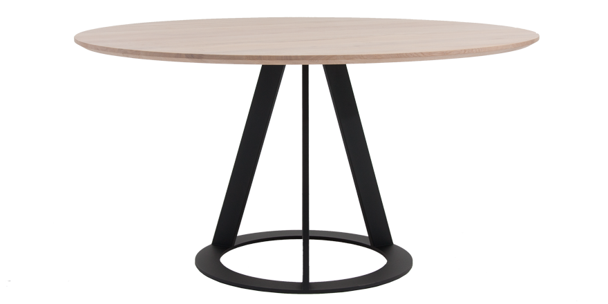 Deze fiere tafel heeft een ovalen of rond blad en een kunstige poot in het midden. Vooral de ovalen versie is ideaal voor grotere gezelschappen! het blad is van massief hout in Amerikaans noten of eiken naturel of met een lichte of donkere beits.