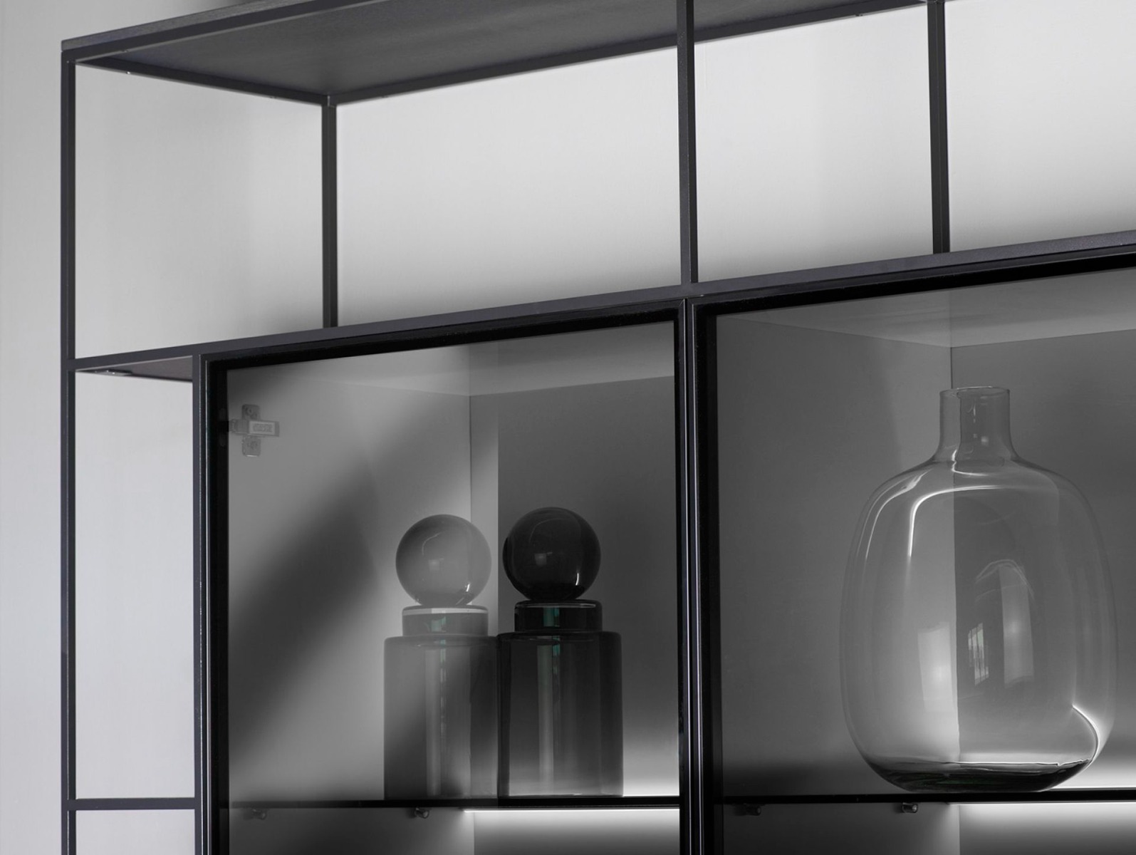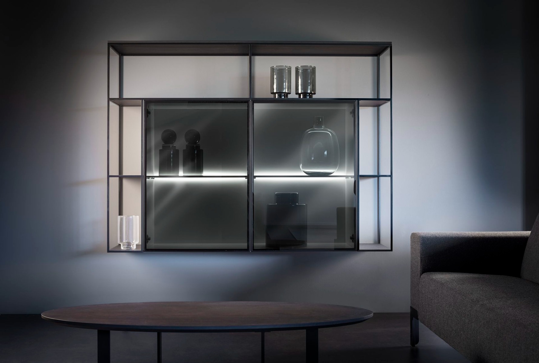 Design vitrine kast met ultra grijs glas. Een uniek vormgegeven design kast van Interstar met deuren van ultra grijs glas (of helder glas), verlicht door middel van een dimbare LED glas schap. Het stalen zwevende frame maakt de Interstar 218-10 wandkast compleet.