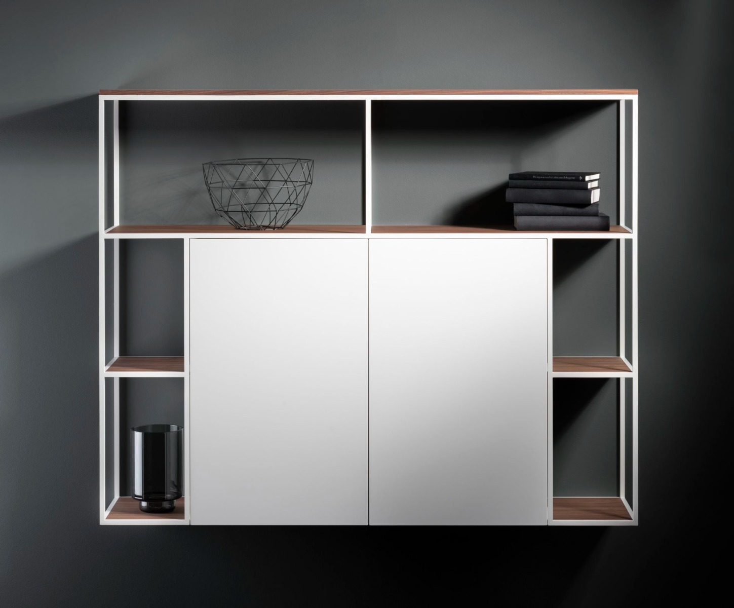 Een zwevend U frame, dat is wat de Interstar 218-20 bekend om staat. Kies in plaats van dichte deuren voor mooie vitrine deuren in ultragrijs glas of helder glas. Zo kunt u elke design wandkast van Interstar naar wens in delen.