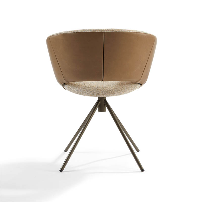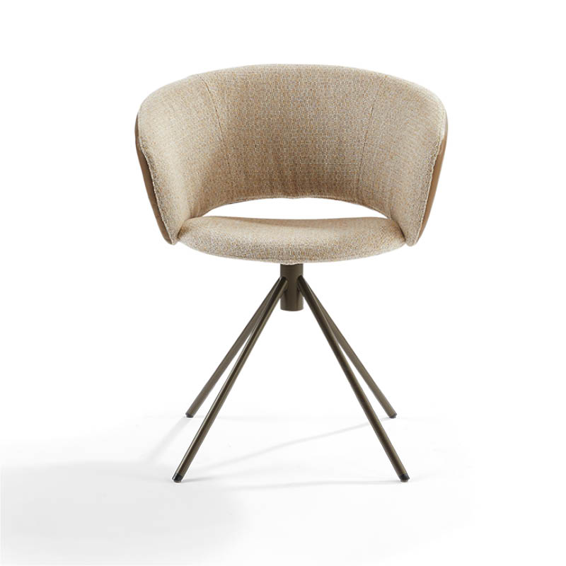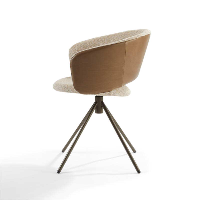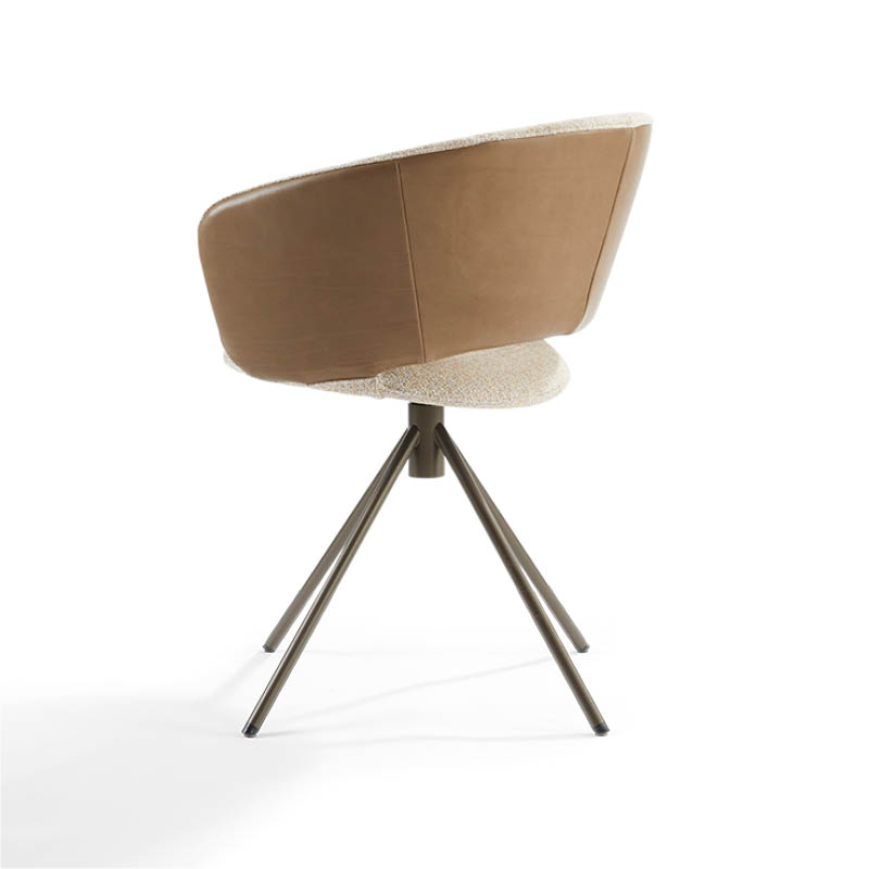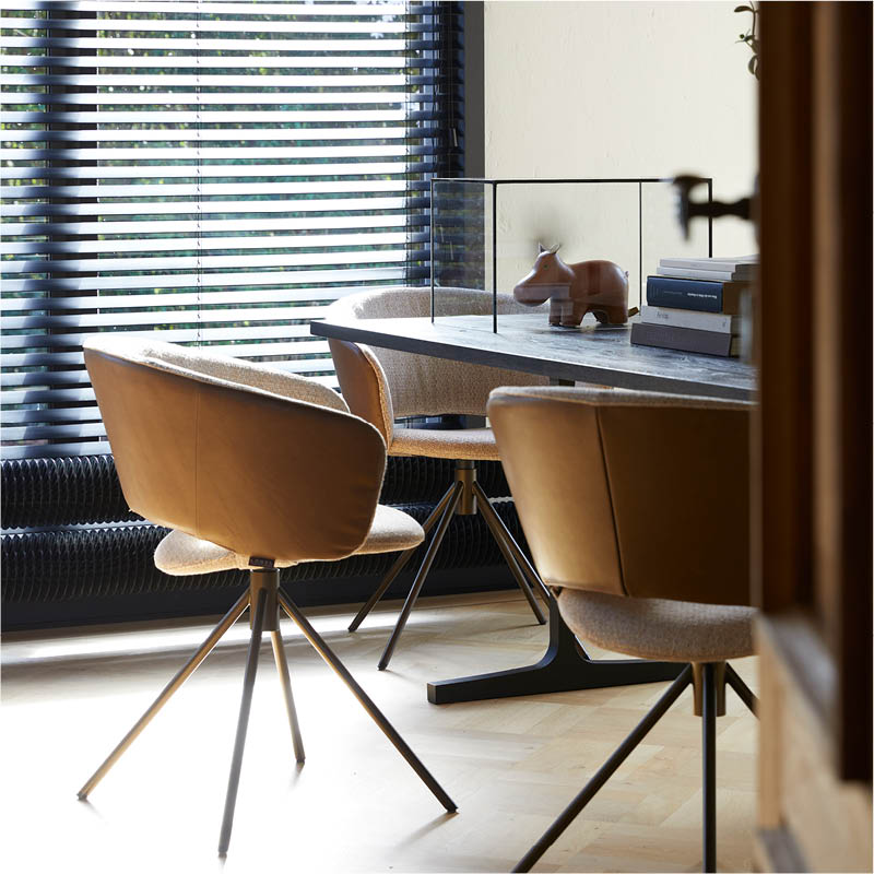 Dankzij het stoere 4-poots steronderstel, vast of draaibaar, past de Lola perfect aan een ronde tafel, maar ook als stijlvol contrast aan een rechte eettafel. Verkrijgbaar in stof, leer of een unieke combinatie van beide. Een designstoel waar u jarenlang plezier van heeft.