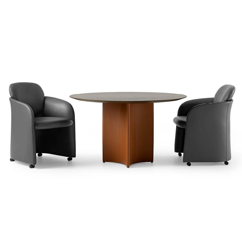 De praktische ronde Conka tafel van Leolux is herkenbaar aan de markante leren voet. Het opvallende ontwerp van Studio kaschkasch brengt een elegante, multifunctionele tafel die met een tafelblad van massief hout of ceramic direct karakter brengt in uw zit- of eetkamer. Het tafelblad is in diverse materialen uitvoerbaar en ook voor het leer heeft u keuze uit diverse kleuren.