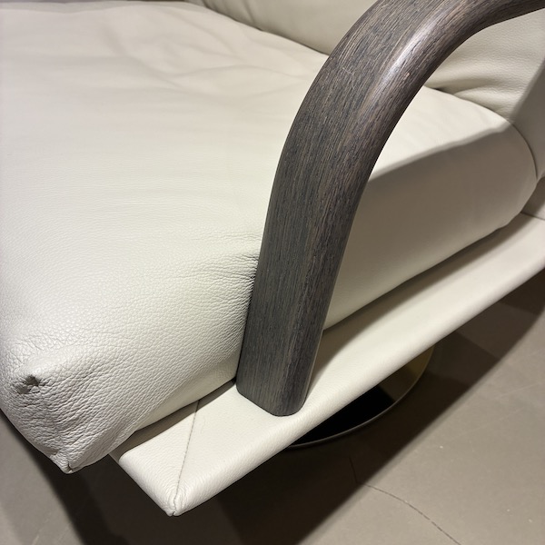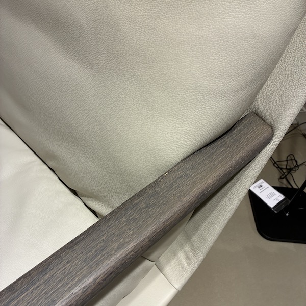 - Daarnaast zorgt de ronde RVS disc voet voor een krachtige basis in het ontwerp. Het witte leer oogt rustig en chique, zeker in contrast met het grijze eiken in de armleuningen. Een mooie balans tussen modern en natuurlijk.