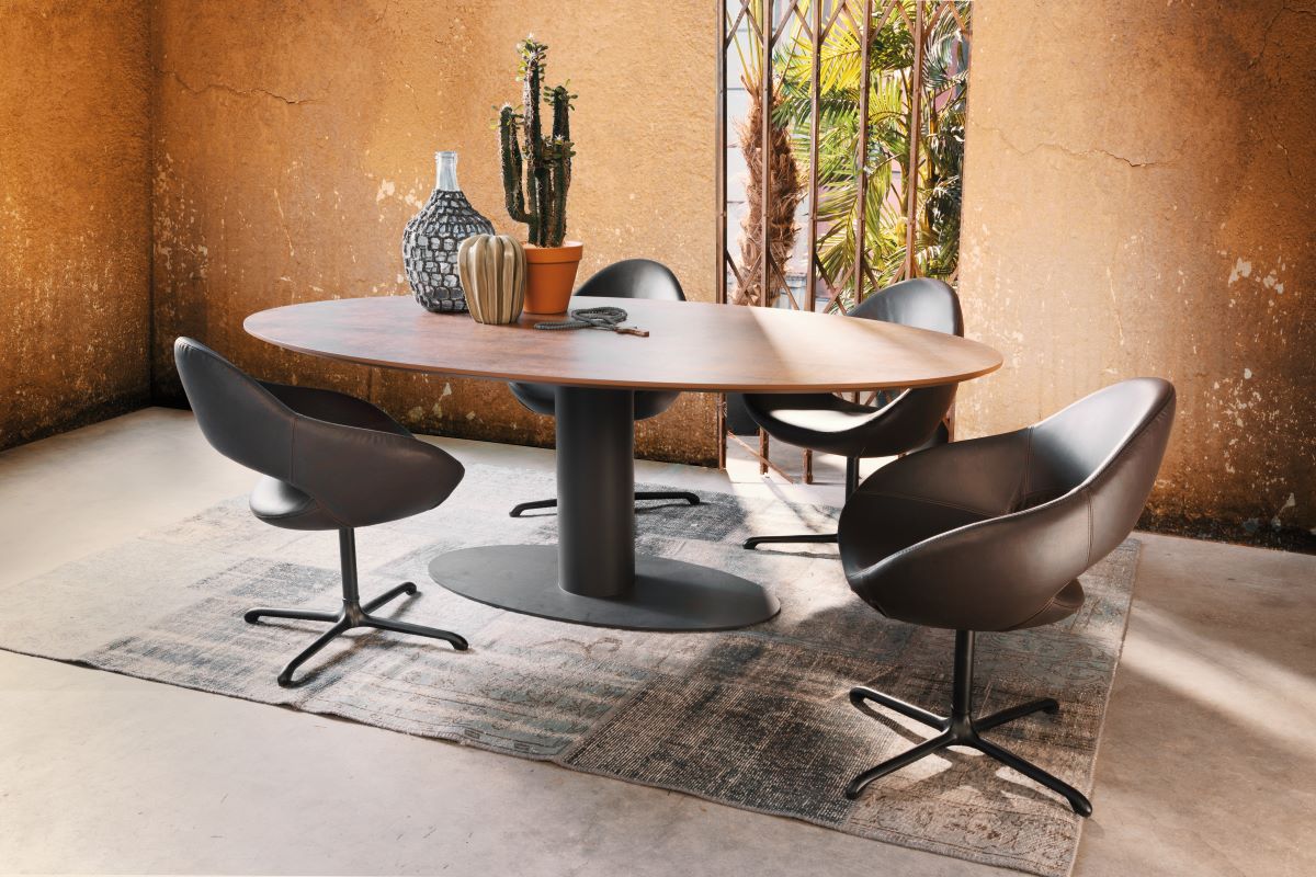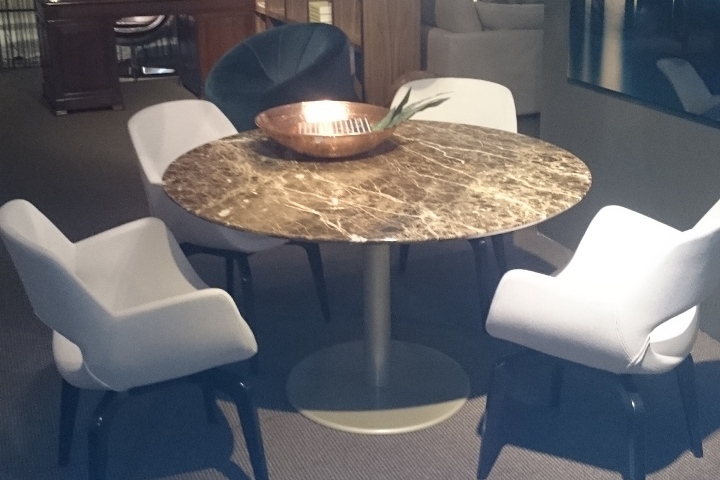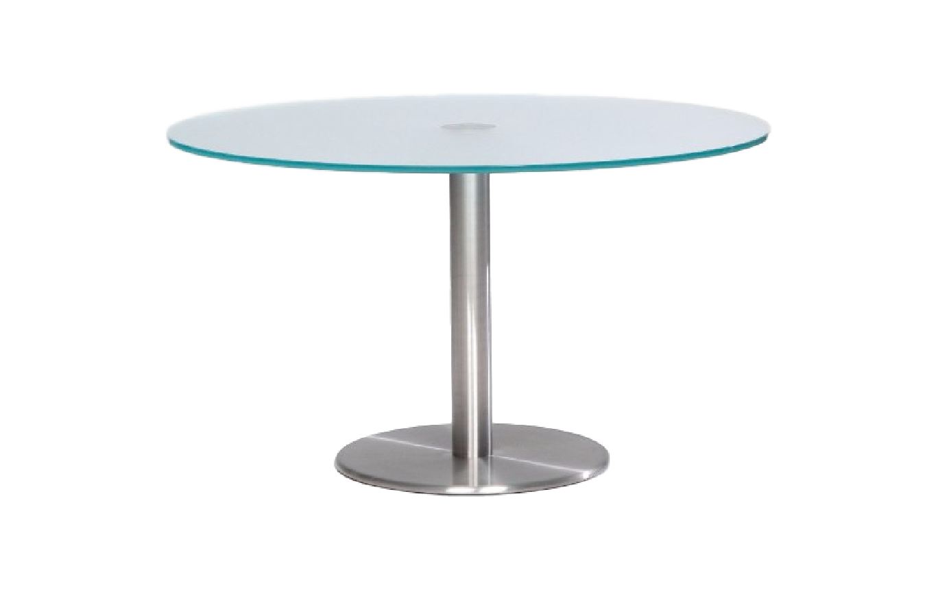 MaterialenGlas, HPL, massief hout, quartzsteen, compo, gebrand graniet of keramiek*Frame RVS, chroom of gelakt* keramiek max. Ø 100 of Ø 120 cm, afhankelijk van kleur