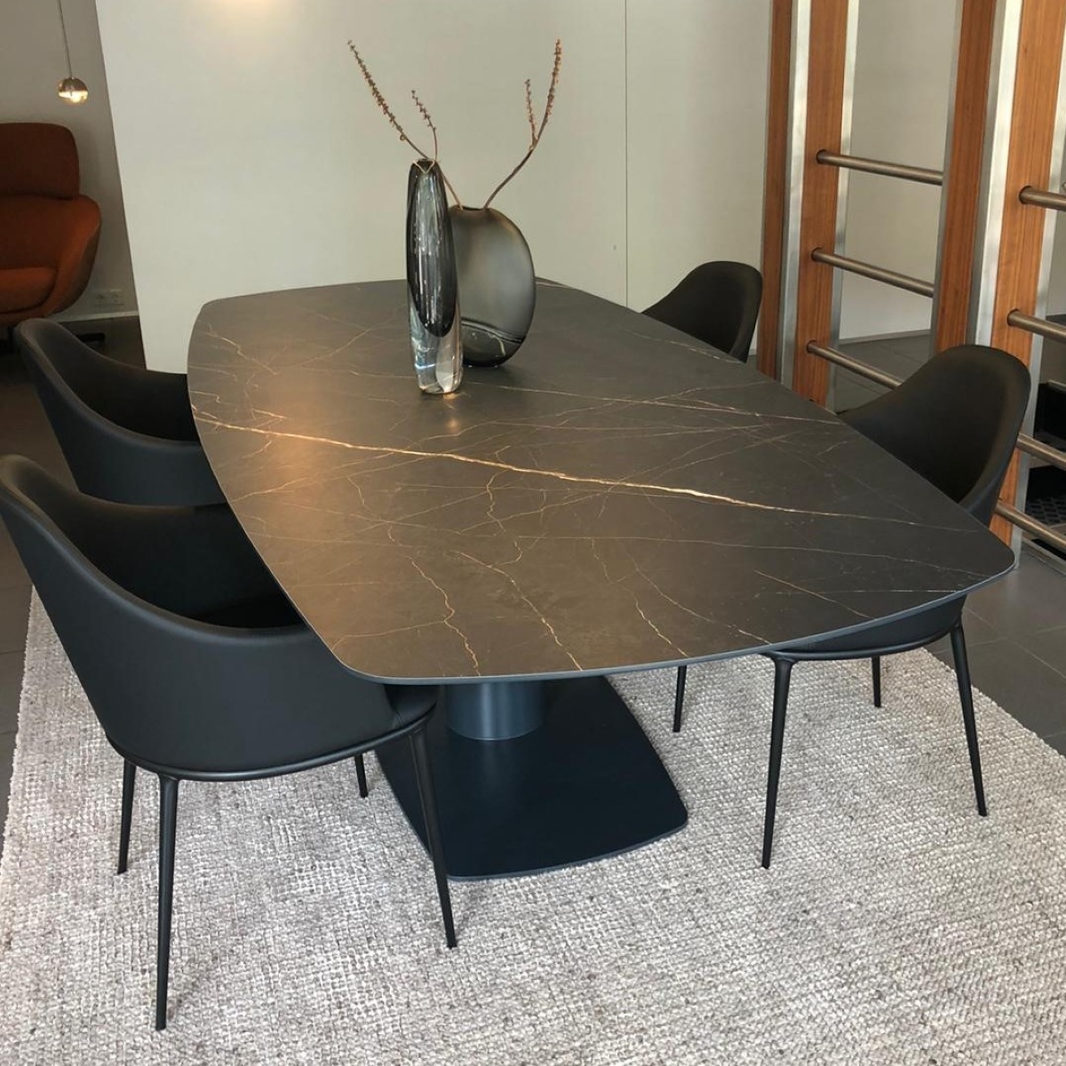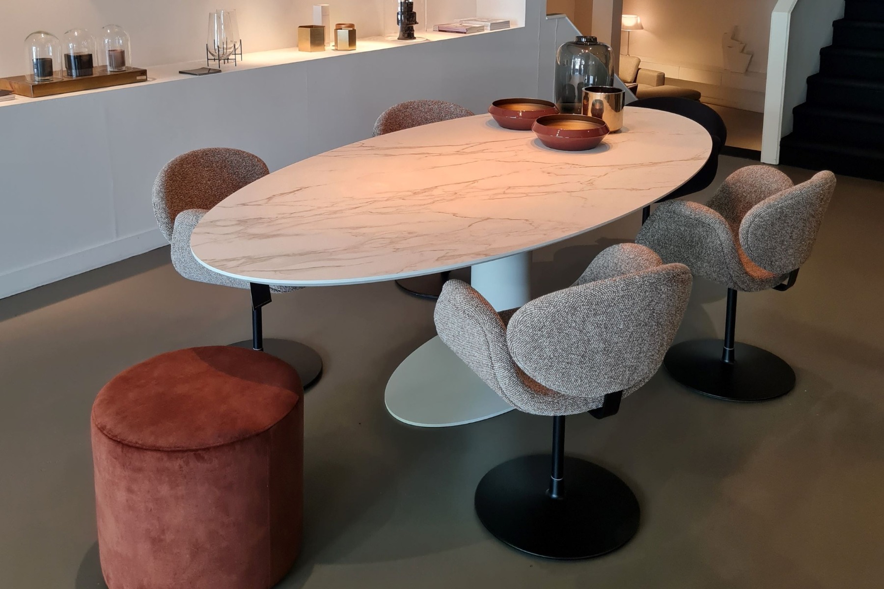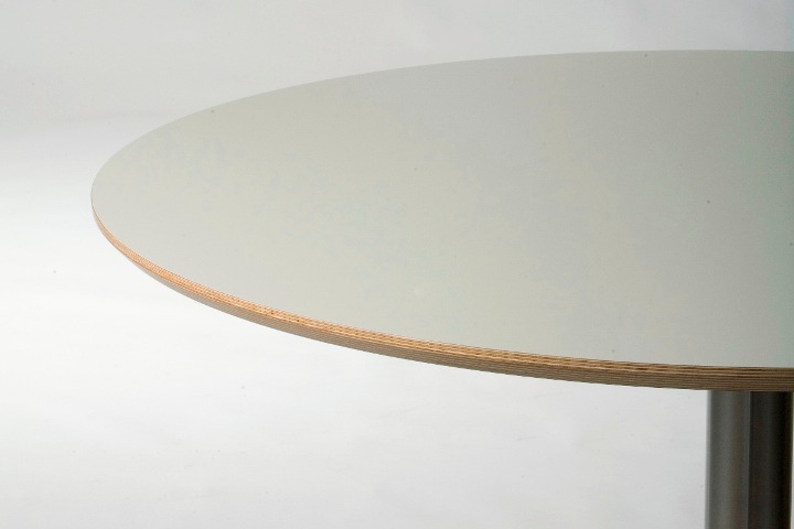 AfbeeldingenØ 130 x 75 cm, Geëtst gehard glas, 15 mm dik, Frame (voet Ø60 cm) RVSØ 130 x 75 cm, Marmer emparador 20 mm, Frame lakØ 130 x 75 cm, HPL fenix bianco alaska, frame lak alaskaHPL op 24 mm berkenmultiplex (detail)