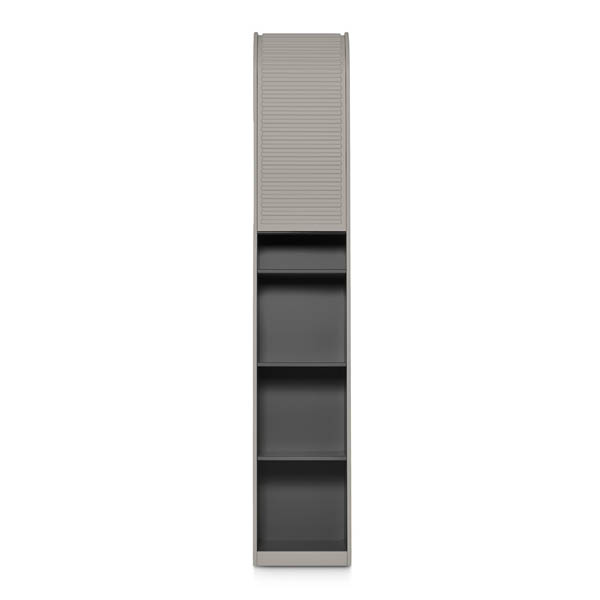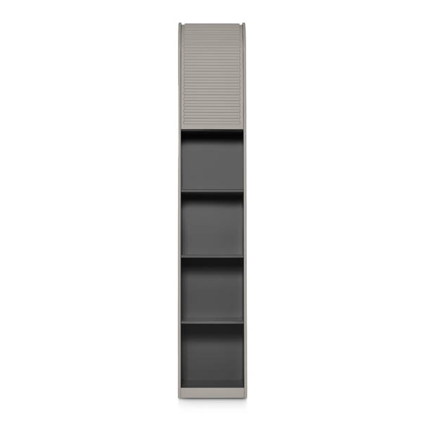 Zoekt u een slanke, opvallende designkast in donkergrijs? De hoge A’dammer kast van Pastoe (205 cm) is een echte blikvanger. Met vijf open vakken biedt hij ruimte om boeken, accessoires of dierbare objecten stijlvol te presenteren. Het karakteristieke rolluik verdwijnt bij openen elegant in de achterkant van de kast. Het ontwerp van Aldo van den Nieuwelaar uit 1978 blijft krachtig en relevant, terwijl de diepe grijstint een moderne, ingetogen uitstraling geeft. Te zien bij Van Waay Interieurs.