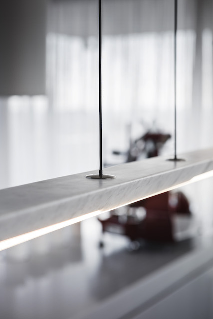 Een minimalistische en eigentijdse vorm: de Woody design hanglamp van Italiaans verlichting merk Penta. Dankzij het decoratieve element van Carrara-marmer, wordt de uitstraling van deze hanglamp bijzonder luxueus.