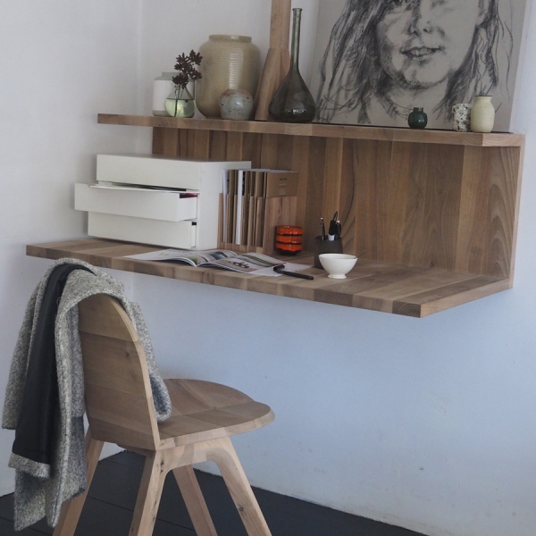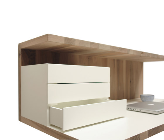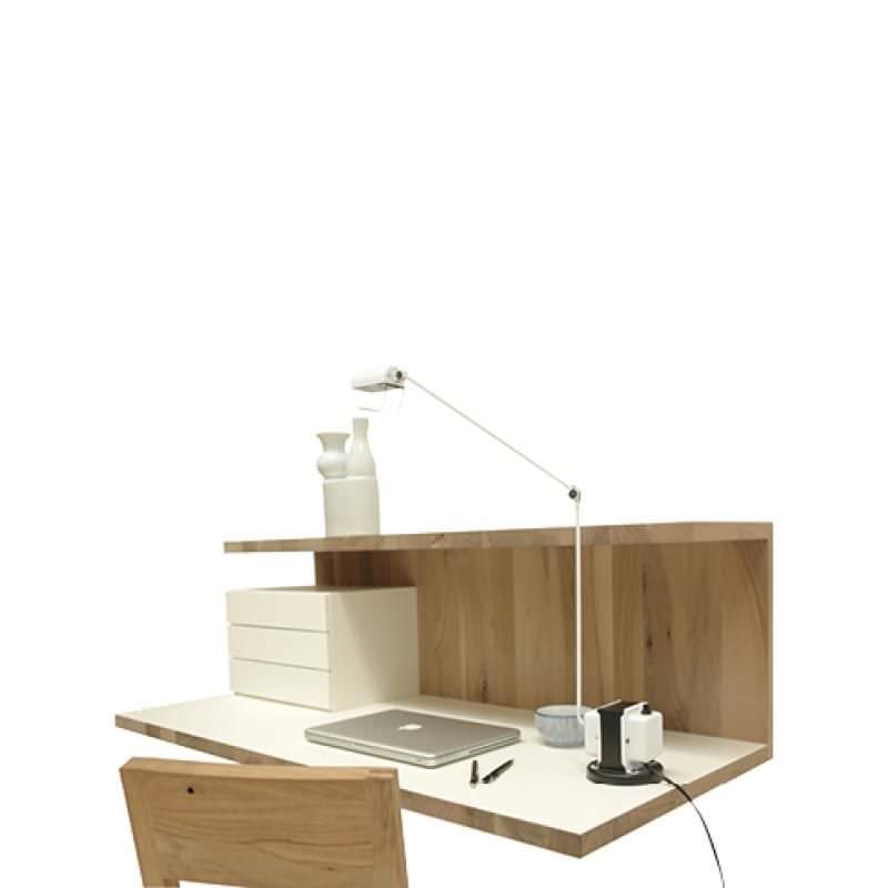 Een eenvoudige vormgegeven en toch uiterst functioneel werkmeubel. Het geeft ruimte aan monitor en laptop. Het apart leverbaar bijpassend ladeblokje van gespoten MDF zorgt voor een opgeruimde werkplek.