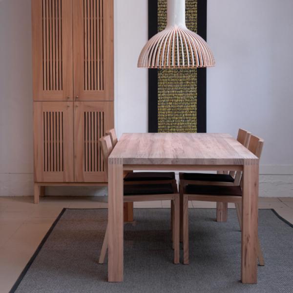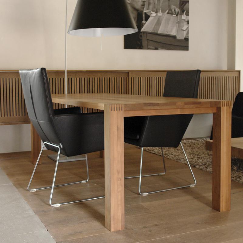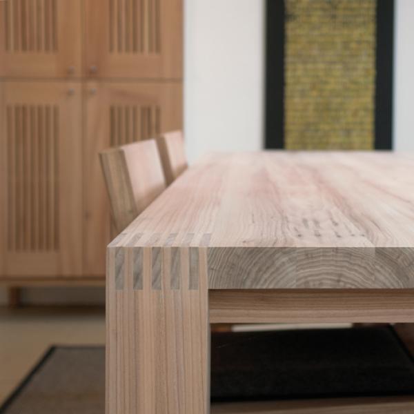 Een ingetogen tafel, met op de hoeken een zichtbare tandverbinding met de poten.
