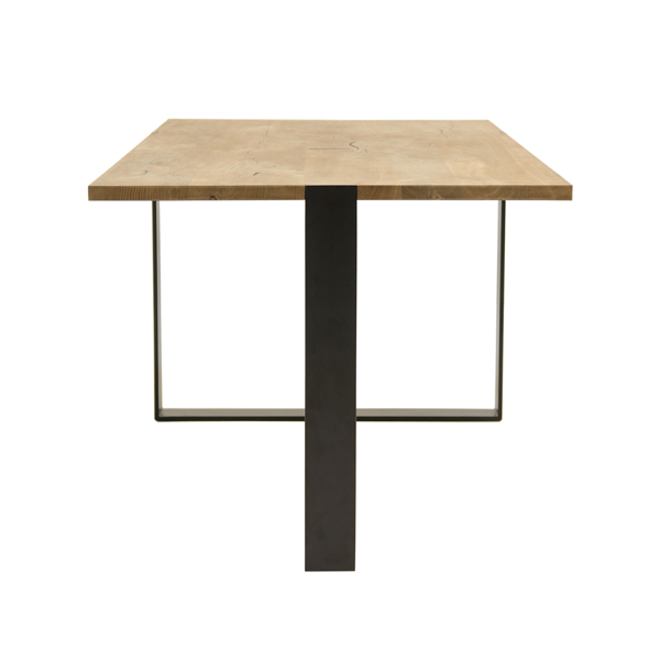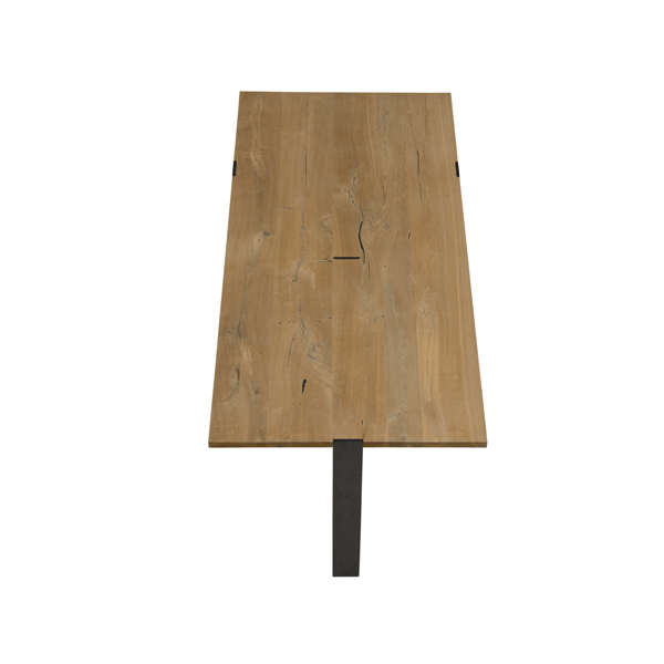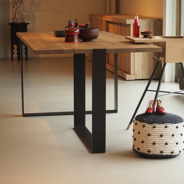 De onvolmaaktheden van het eikenhout worden ingezet tot een bijzonder beeldend element. De karakteristieke scheuren zijn gevuld met zwart rubber, dat perfect combineert met het zwart gecoat metalen onderstel.