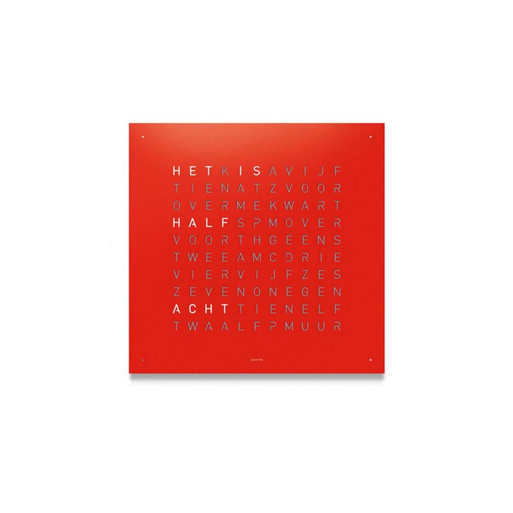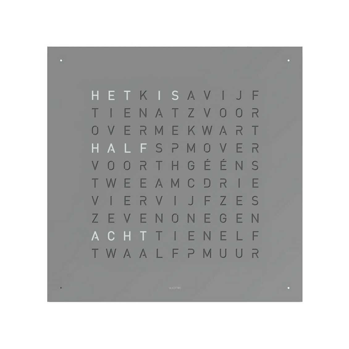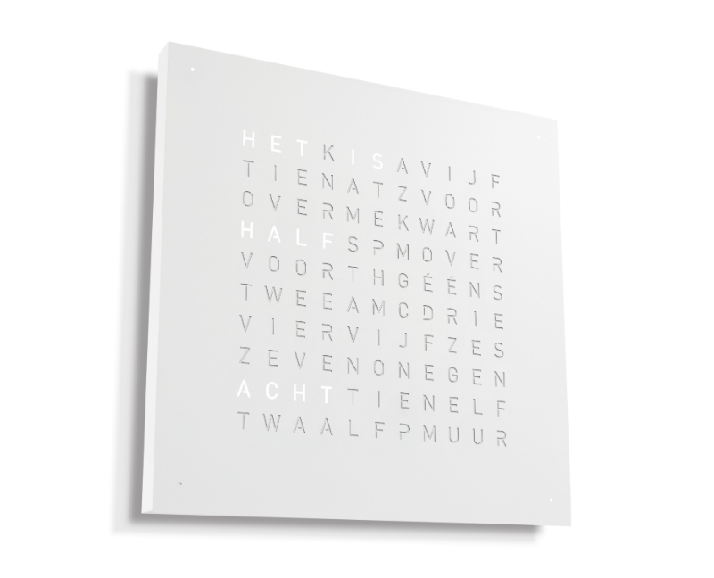 De QLOCKTWO Large is een opvallende designklok van 90×90 cm die direct de aandacht trekt in elk interieur of werkruimte. In plaats van cijfers toont de klok de tijd in woorden, waarbij elke vijf minuten wordt aangegeven en de overige minuten door lichtpuntjes in de hoeken van de klok. Met de gratis app ‘Flashsetter’ past u de tijd eenvoudig via uw smartphone aan.