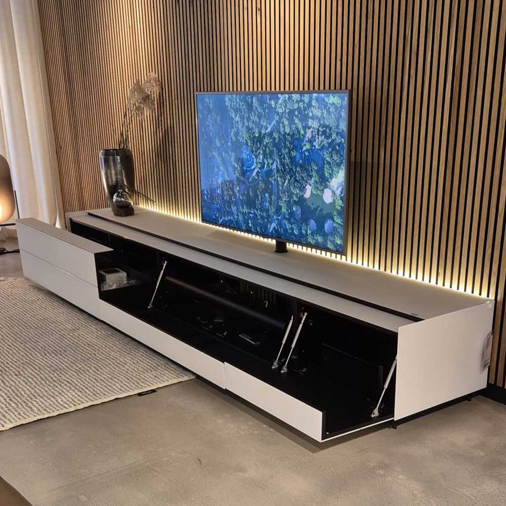 Stijlvol én slim, dat zijn de Spectral kasten. Zo ook dit elegante witte showroommodel die nu voor een outlet prijs beschikbaar is in onze showroom. Het TV-meubel is voorzien van een draaibare TV-beugel en dimbaar Smart Light. Al uw (audio)apparatuur bergt u handig op achter de zwarte stofklep. Bekijk deze brede, lage, en luxe kast voor de televisie nu bij van Waay interieurs.