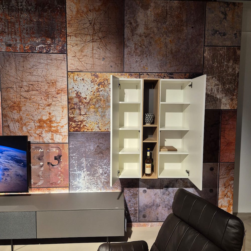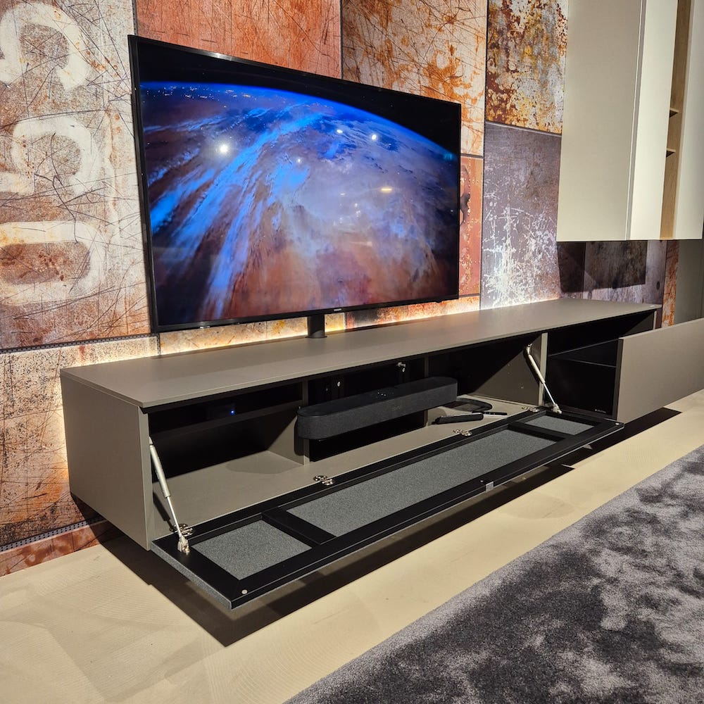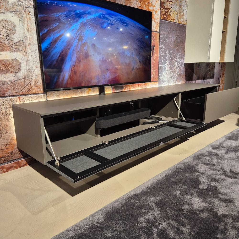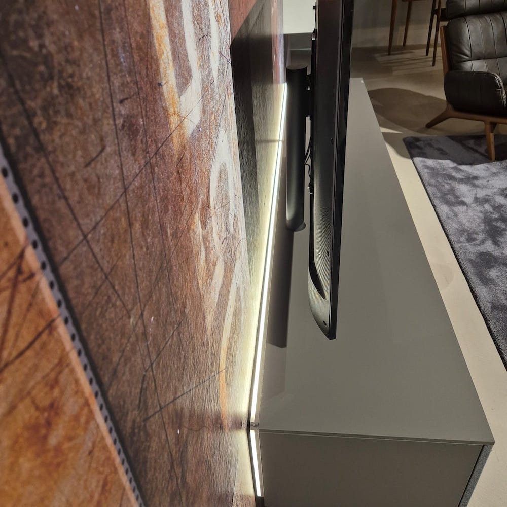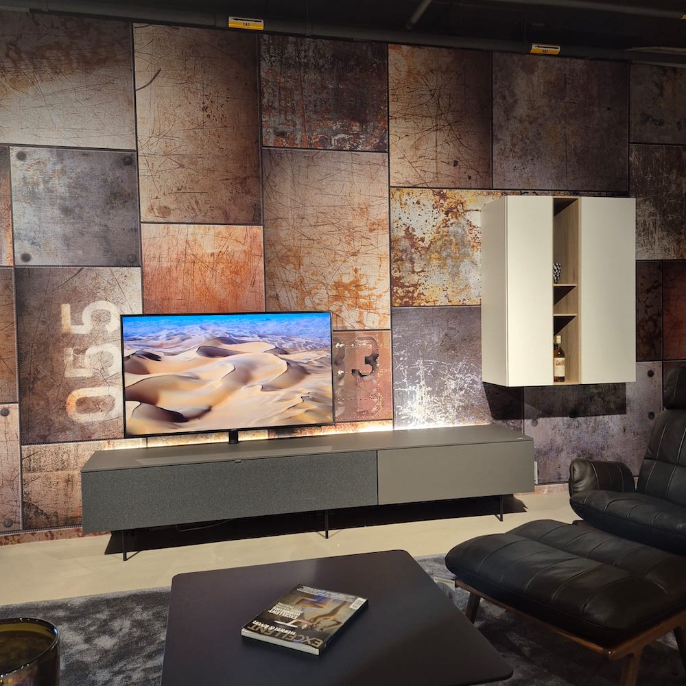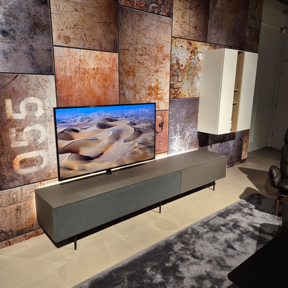 Schitterende TV-meubel combinatie van Spectral met een grijze lage kast voor de televisie en een hangkast voor aan de wand in het wit. De lage kast is voorzien van verlichting aan de achterzijde en heeft twee kleppen waarvan één met speakerdoek. Het lage TV-meubel staat zeer fraai op smalle zwarte pootjes en aan de binnenzijde kunt u al het (audio)apparatuur wegwerken.