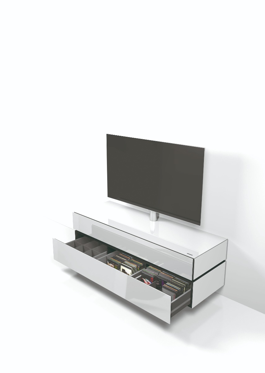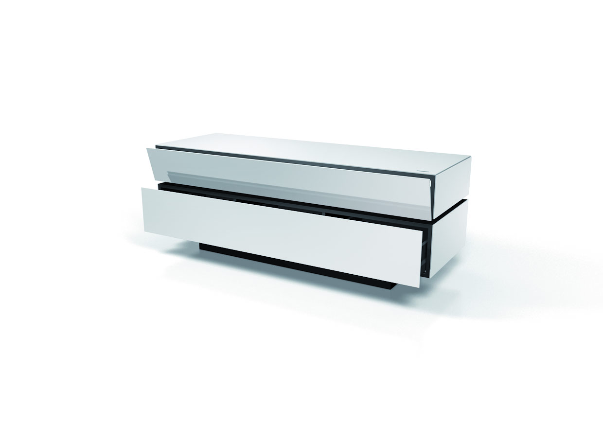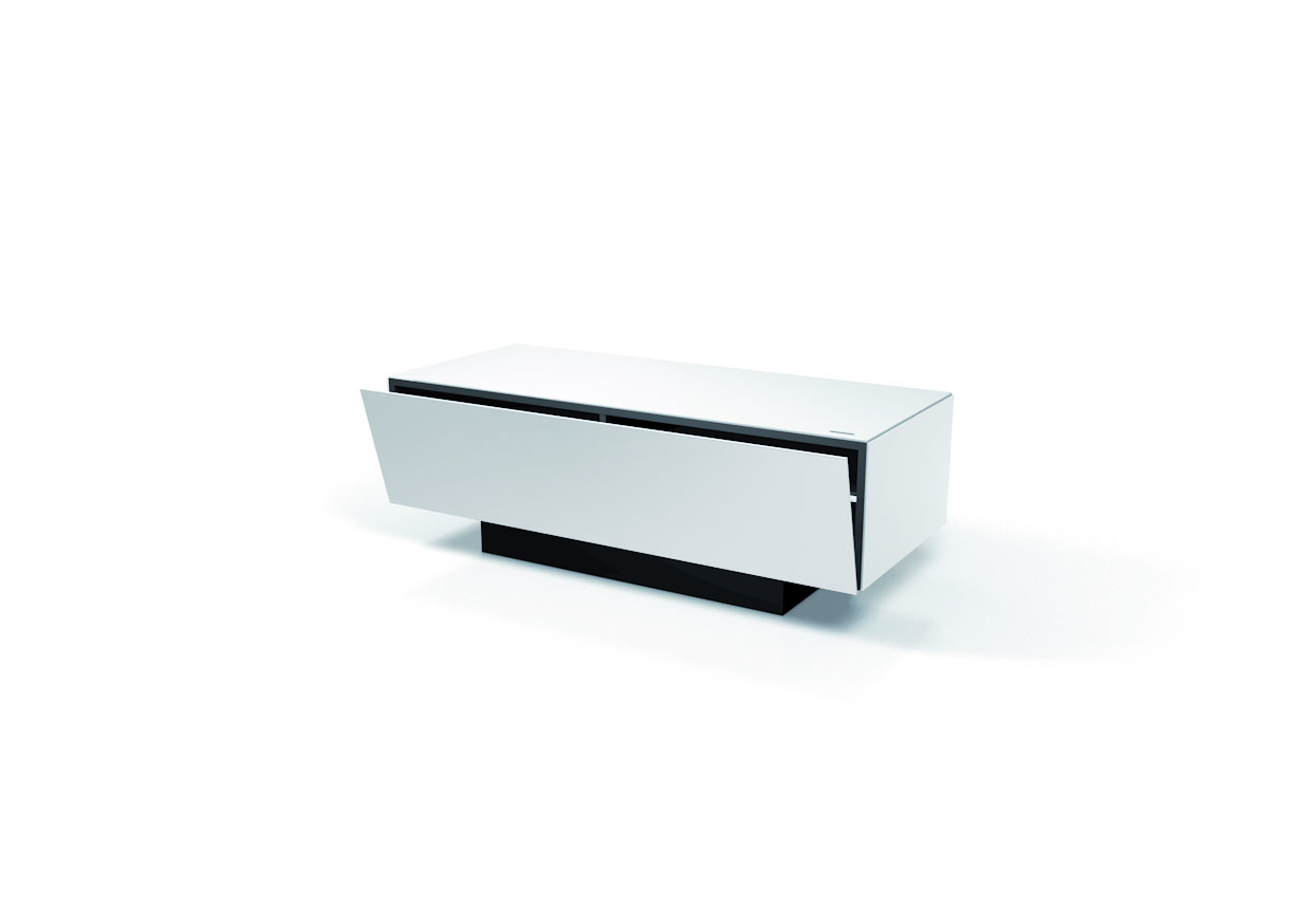 Ervaar een leven met Spectral Brick. Het eerste tv meubel met het geluidsysteem verborgen in de sokkel. Terwijl u de techniek achter het geluid niet ziet, kunt u wel genieten van een geweldige homecinema ervaring. Achter de luxe glasfronten is ruimte in overvloed voor de verschillende randapparatuur. Karakteristiek voor de Spectral Brick is de teruggetrokken sokkel. Hierdoor lijkt het meubel boven de grond te zweven. Naast de standaard, zwarte sokkel is er ook een gepolijste sokkel in edelstaal (RVS). Is dit niet indrukwekkend genoeg? U kunt de sokkel ook uitvoeren met het BRA1 soundsysteem, of het Bose systeem.