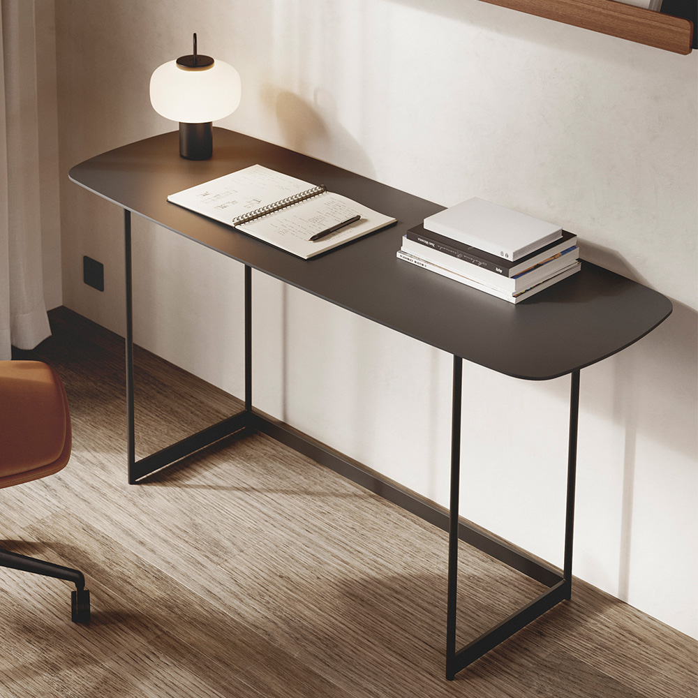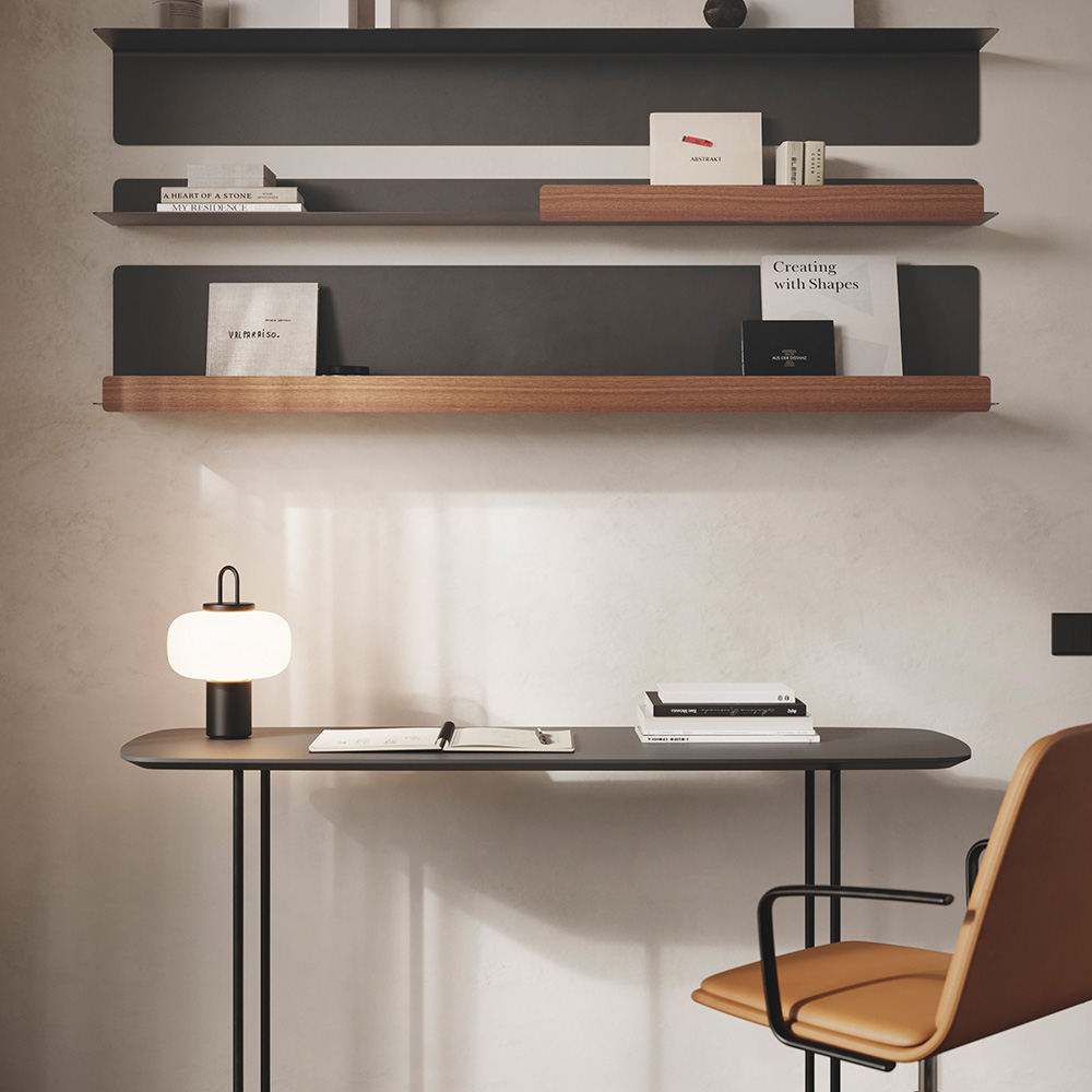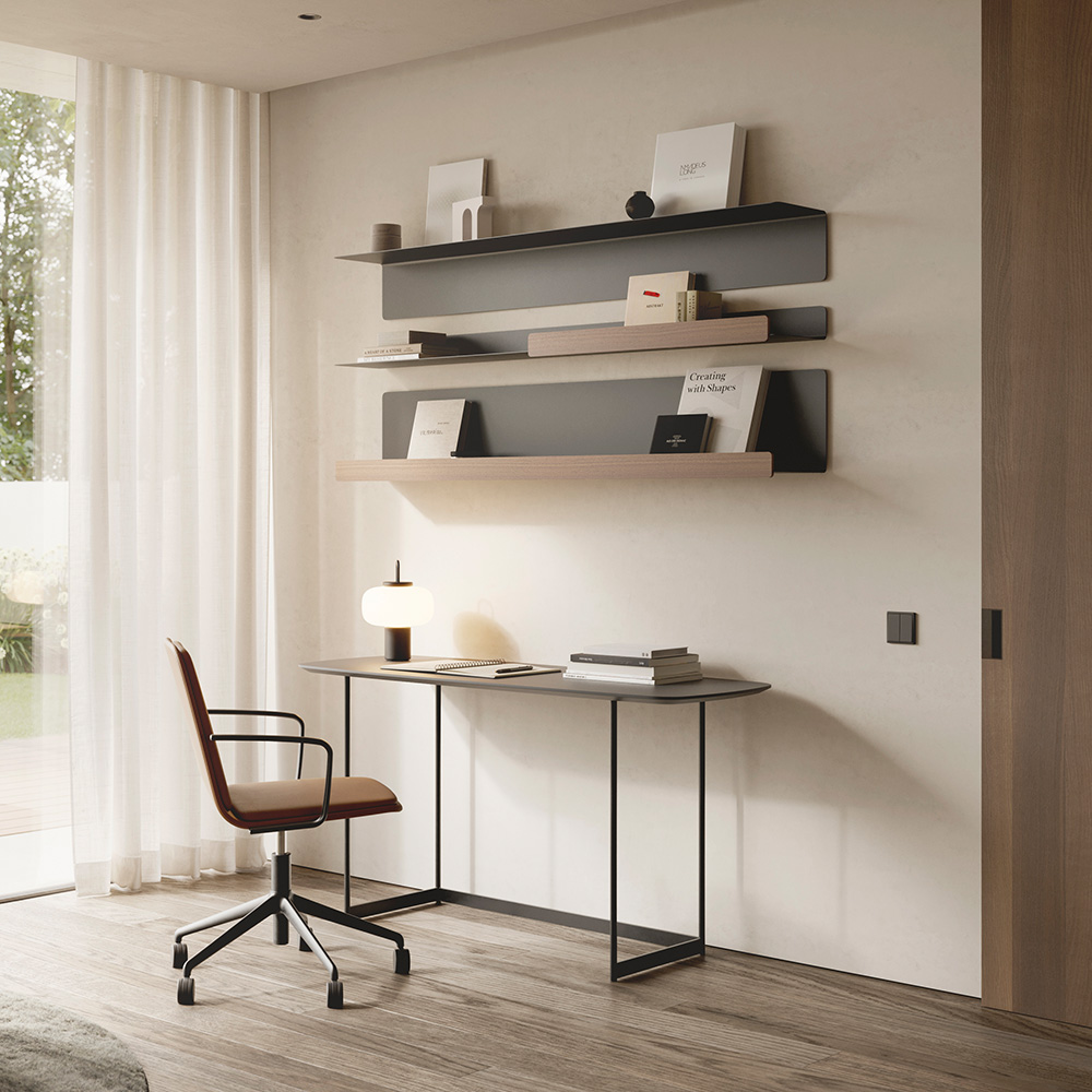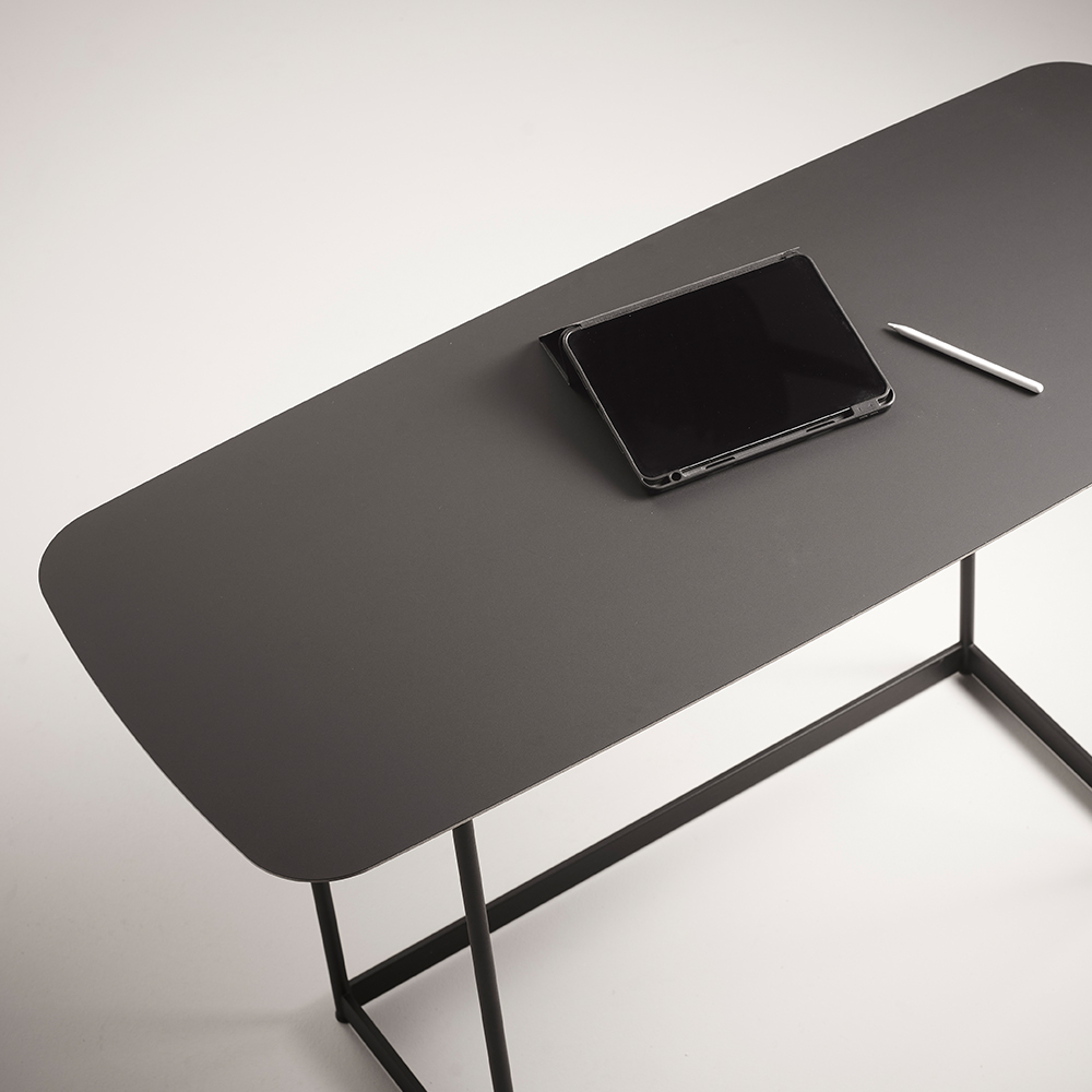 Het Luma bureau creƫert een werkruimte in huis die geen concessies doet aan comfort of aan de gezellige huiselijke sfeer. Het lichte zwart metalen bureau kan gemakkelijk in elke ruimte geplaatst worden voor een elegant en stijlvol werkhoekje met een tafel voor uw laptop. Het bureau heeft een organisch gevormd blad met ronde hoeken en oogt heel ruimtelijk door de smalle poten. De metalen poten kunnen worden gepersonaliseerd met een van de lakken van Treku, terwijl het tafelblad kan worden afgewerkt met hout- of Fenix-afwerkingen. Onze interieur deskundigen helpen u graag met alle opties voor het Treku Luma bureau.