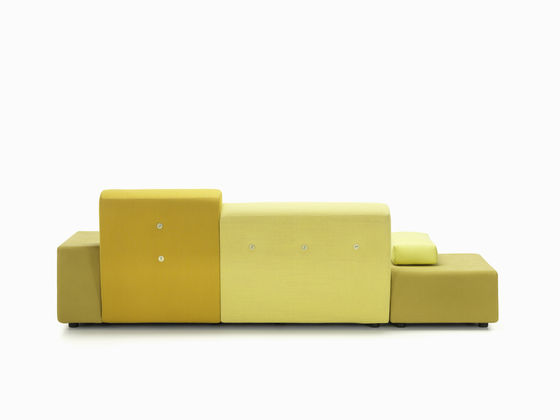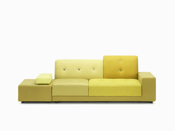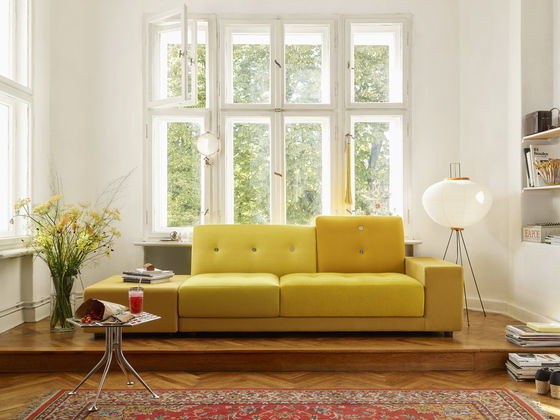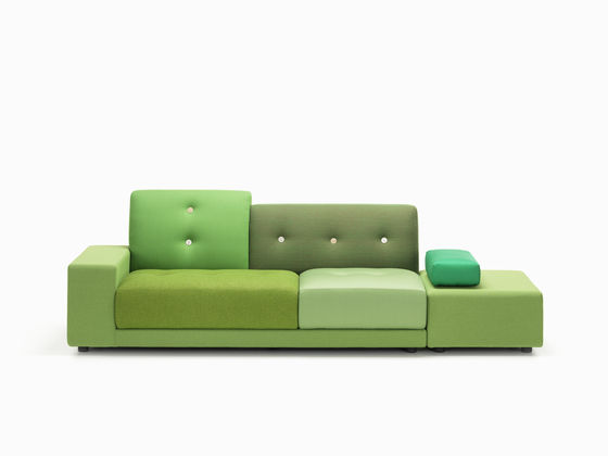 De Polder Sofa en Polder Compact van Hella Jongerius combineren comfort met opvallend design. Hun grote, asymmetrische kussens en gestoffeerde body zorgen voor een veelzijdig zit- of ligoppervlak. De Polder Sofa heeft een lage armleuning en optioneel platform voor magazines, terwijl de Compact twee armleuningen biedt. Beide modellen kunnen links- of rechtsom worden geplaatst. Exclusieve Vitra-stoffen in harmonieuze kleuren en knopen van kunststof, aluminium en leder versterken de unieke uitstraling en maken de bekleding eenvoudig te reinigen.