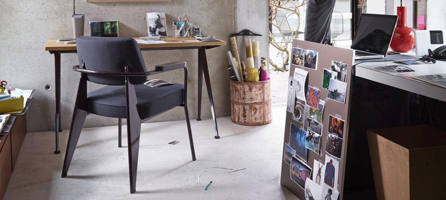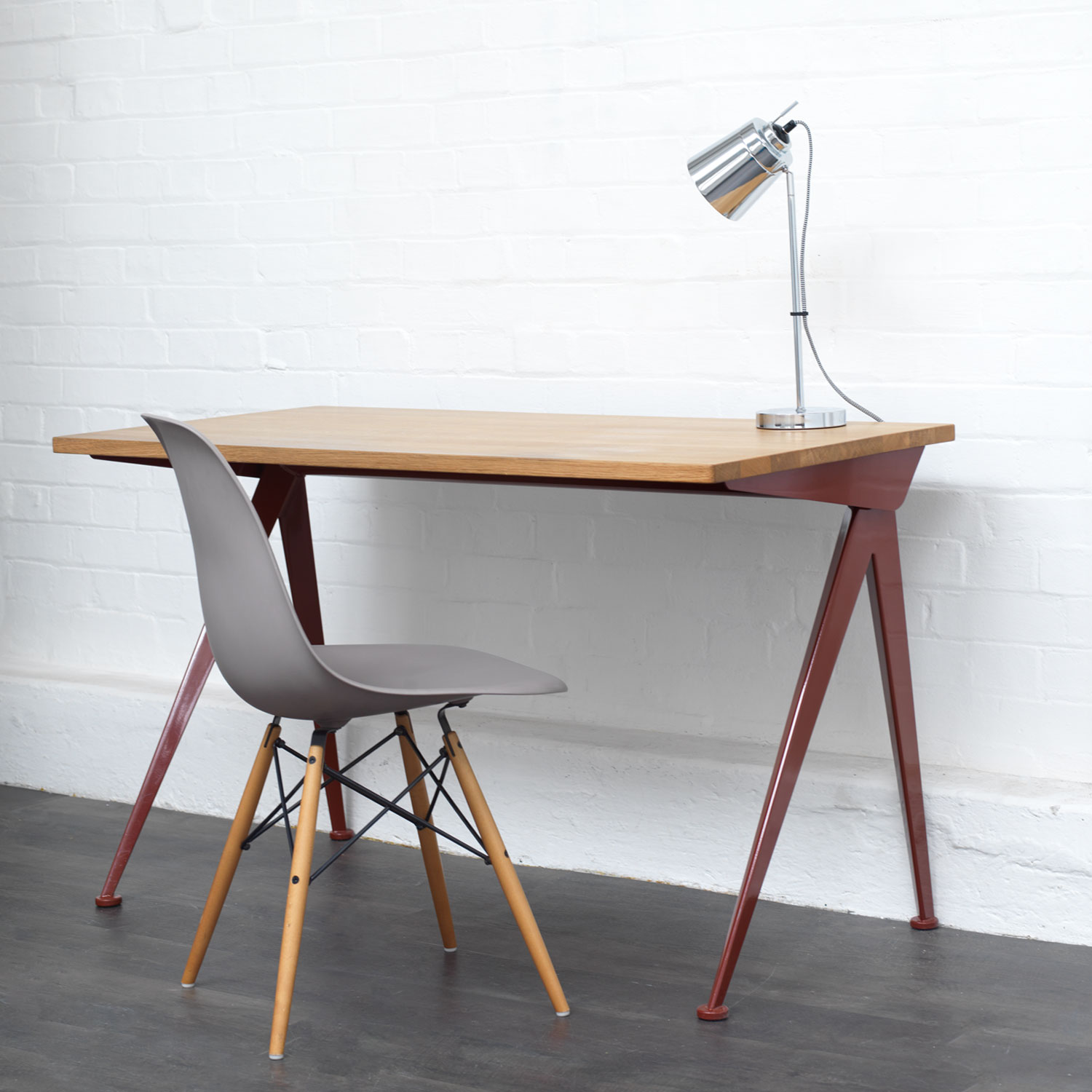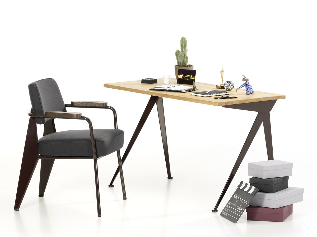Rond 1950 ontwierp Jean Prouvé verschillende versies van de Compas tafel, en baseerde zich daarbij op de constructieprincipes waar hij om bekendstaat. Allemaal hebben ze de slanke, elegant gespreide poten gemeen, die doen denken aan de wijzers van een kompas, in het Frans ‘compas’.Het tafelblad van massief geolied hout verleent de Compas Direction een individueel accent. Door de compacte afmetingen is het bureau ideaal voor het moderne thuiskantoor, waar bijna geen papier meer aan te pas komt.