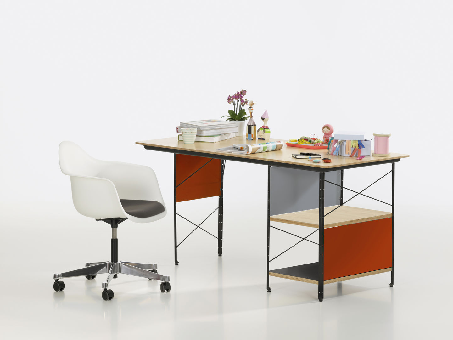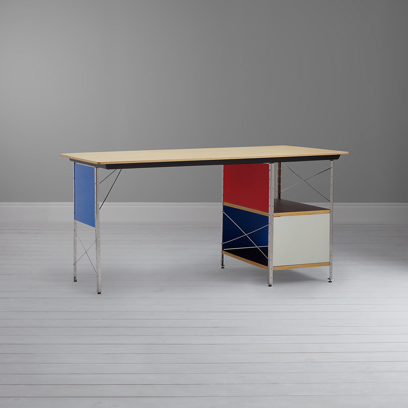 De Eames Desk Unit (EDU) is een herinterpretatie van het klassieke ontwerp uit 1949 door Charles en Ray Eames. In samenwerking met Hella Jongerius is een modern kleurenschema gekozen, dat het vrolijk en uitnodigend maakt zonder de vintage uitstraling te verliezen. Het tafelblad is multiplex met berkenfineer, met panelen die de opbergruimtes deels afschermen. Het metalen frame is in hoogte verstelbaar.