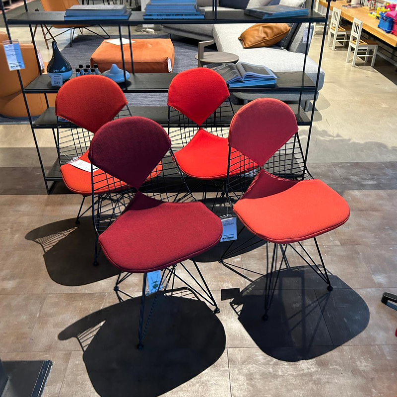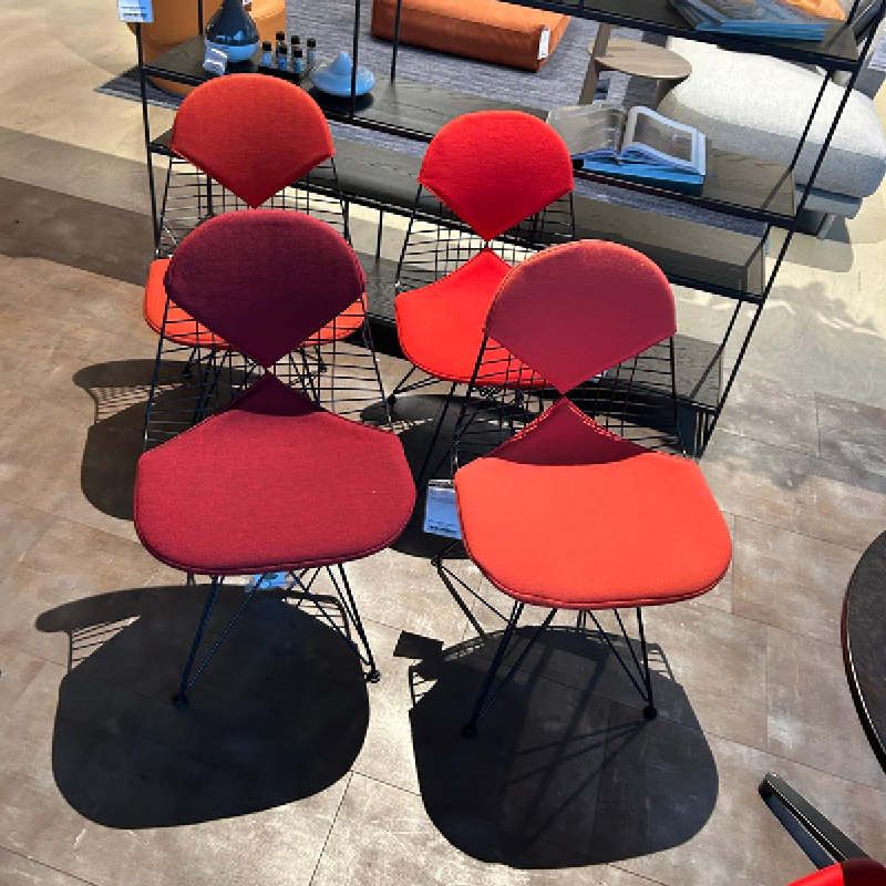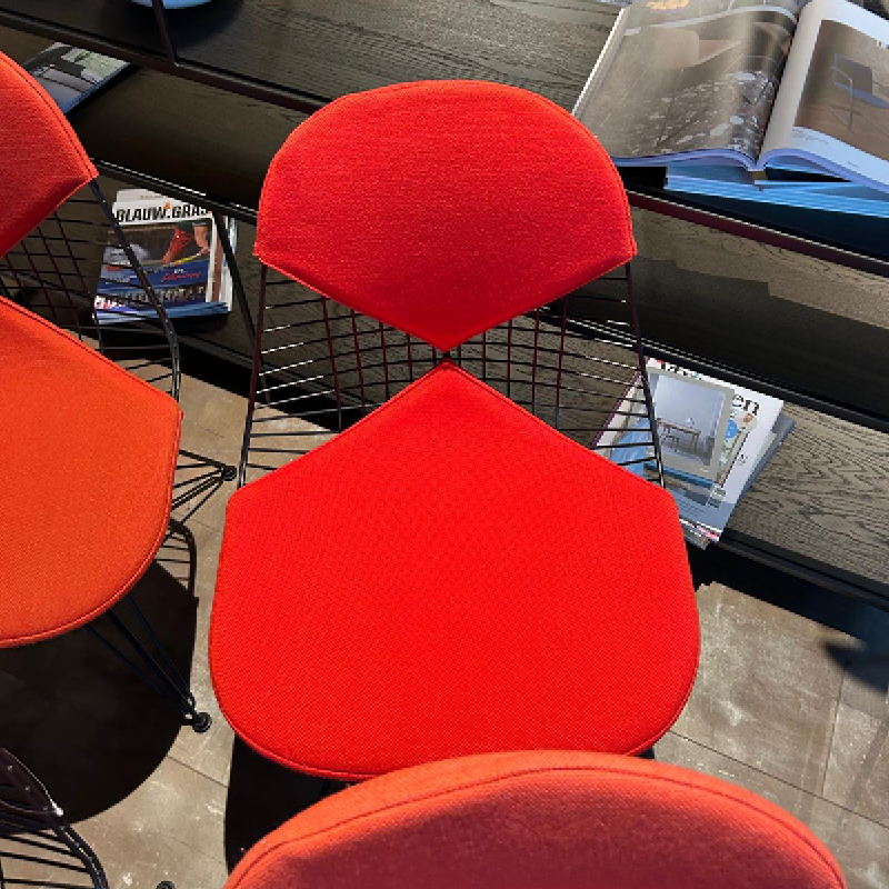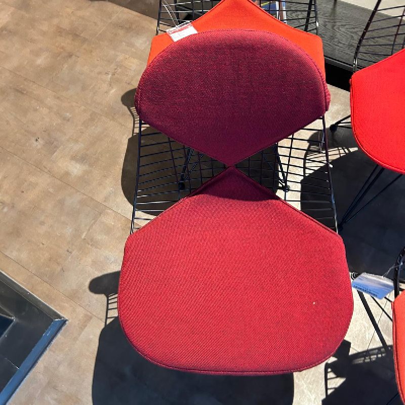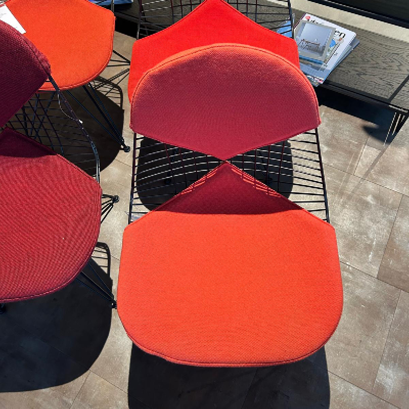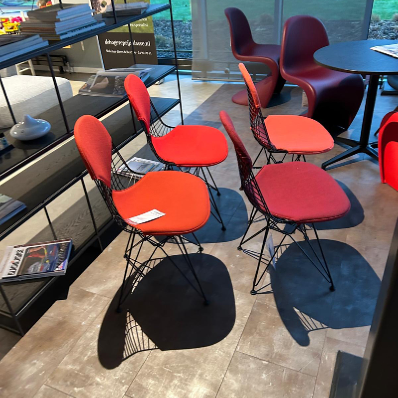 Deze mooie set van 4 zwarte Vitra Wire Chair showroommodellen met verschillende rode tinten is nu voor een outlet prijs beschikbaar in onze showroom! Deze eetstoel van Vitra is een echte design klassieker en herkenbaar aan een opvallend metalen draadframe. De combinatie met verschillende rode bekleding op de zitting en rugleuning geeft een warm en speel effect aan elke eethoek. Als u op zoek bent naar stoere design eetstoelen voor aan een zwarte ronde eettafel is dit een geweldige set. Voeg deze stijlvolle stoelen toe aan uw eetruimte en creëer een echte blikvanger waar iedereen van zal genieten!