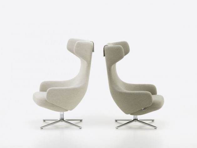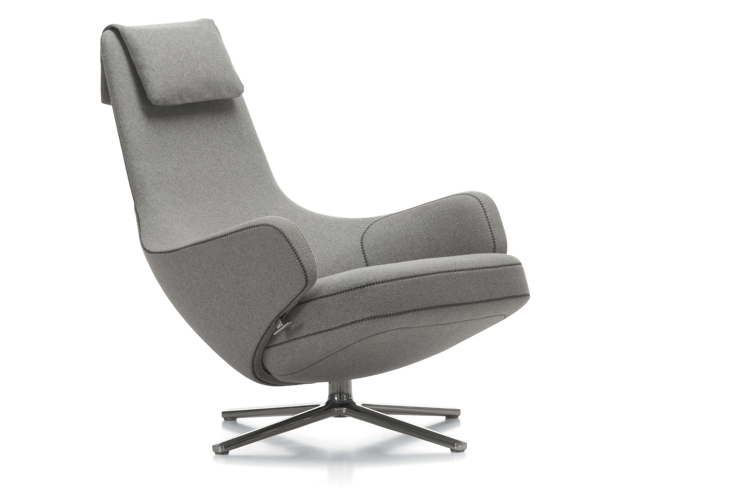 De loungezetels Repos en Grand Repos van Vitra, ontworpen met Antonio Citterio, combineren elegantie met ongekend comfort en maximale flexibiliteit. De royale stoffering, hoge rugleuning en uitnodigende armleuningen maken deze draaibare zetels perfect om te ontspannen. Het verborgen, gesynchroniseerde mechanisme laat u moeiteloos van een rechte zithouding achteroverleunen en de rugleuning in elke stand vergrendelen. De weerstand kan handmatig worden aangepast aan uw gewicht, voor optimale lendensteun bij iedere beweging. Repos, Grand Repos en Ottoman zijn beschikbaar in twee zithoogten.