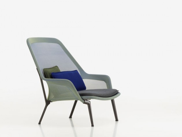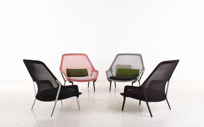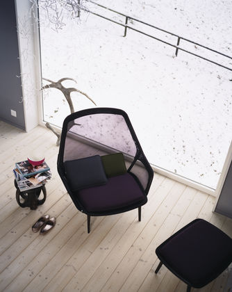 Ronan en Erwan Bouroullec gebruikten voor de Slow Chair oersterk, in vorm gebreid textiel dat als een kous over de stoelconstructie wordt getrokken. Dit geeft de fauteuil een zacht, ergonomisch zitcomfort, versterkt door dunne zitting- en rugkussens. Het transparante materiaal vervangt dikke stoffering en zorgt voor een luchtige uitstraling. De Slow Chair is zowel in de woonkamer als veranda een sober, comfortabel designstuk. Afmetingen Ottoman: B 69,5 x D 52,5 x H 33 cm. Prijzen: Slow Chair €2350,- | Ottoman €1460,- | Set €4710,-