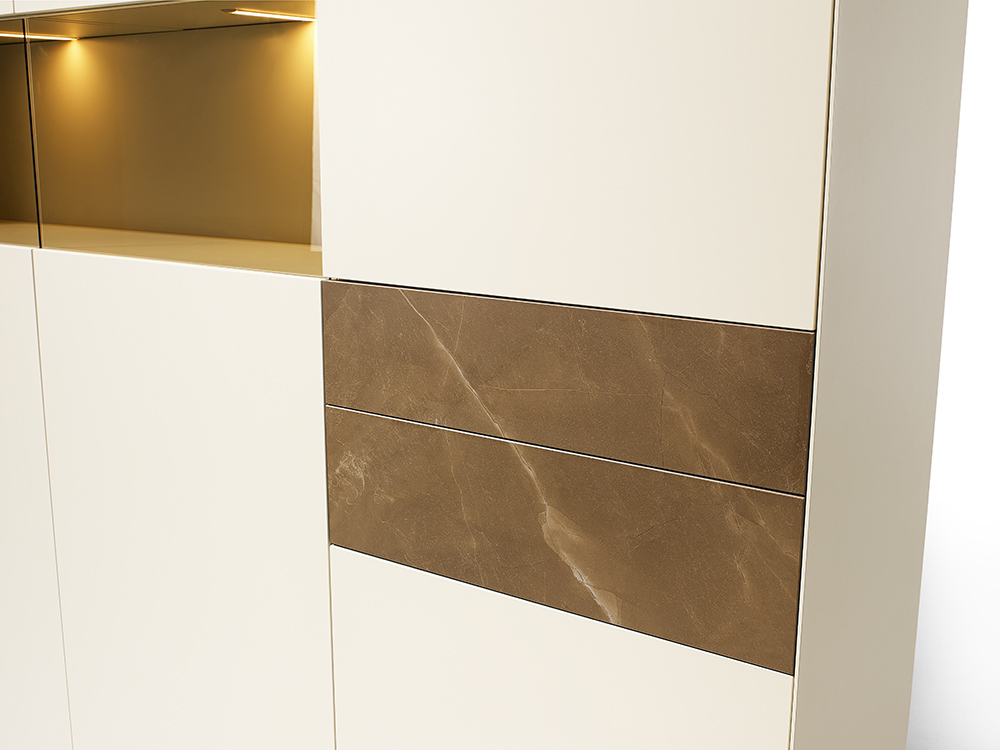 Kies uit diverse materialen zoals structuurlak, handgepolijste hoogglanslak, glas of keramiek, met 16 standaardlakkleuren en meer dan 1000 RAL/NCS-kleuren. Voor keramische bladen wordt hoogwaardige Neolith-keramiek gebruikt, krasvast en 100% UV-bestendig.