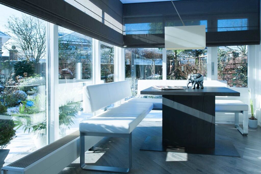 Wij besloten voor een extreme make-over van de hele beneden verdieping. Dus eerst met een aannemer aan de slag (de firma Rokkeveen Ontwerp & Realisatie). Dat bleek al een ingrijpende gebeuren te zijn: andere vloeren, wanden, deuren en deurposten, plafonds en dan woon je zolang op zolder, dus wel even afzien. Vrijwel gelijktijdig hebben wij een rondje gemaakt langs de betere winkels op het gebied van woninginrichting.