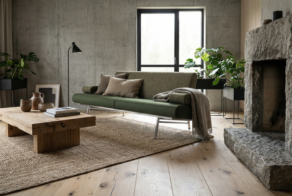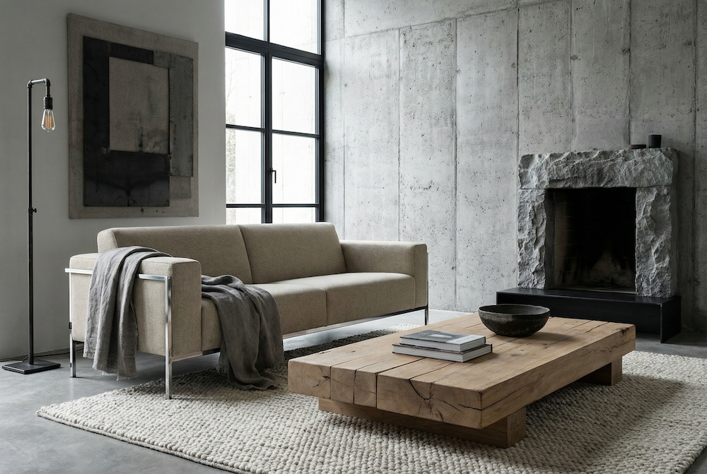 Materialen: onbewerkt eiken, beton, staal, ruw natuursteen, grof linnen, ruw leder