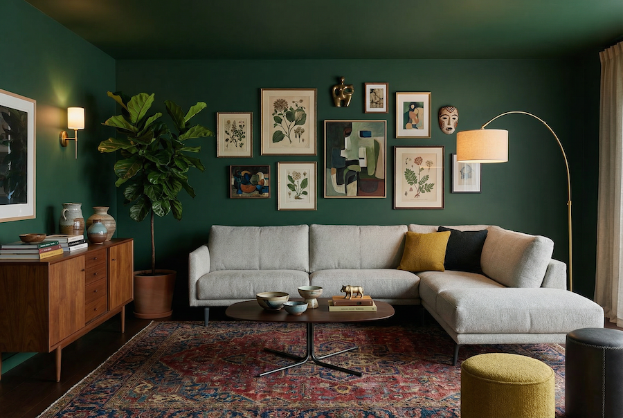 Kleuren: moody blues, greens en rijke accenten